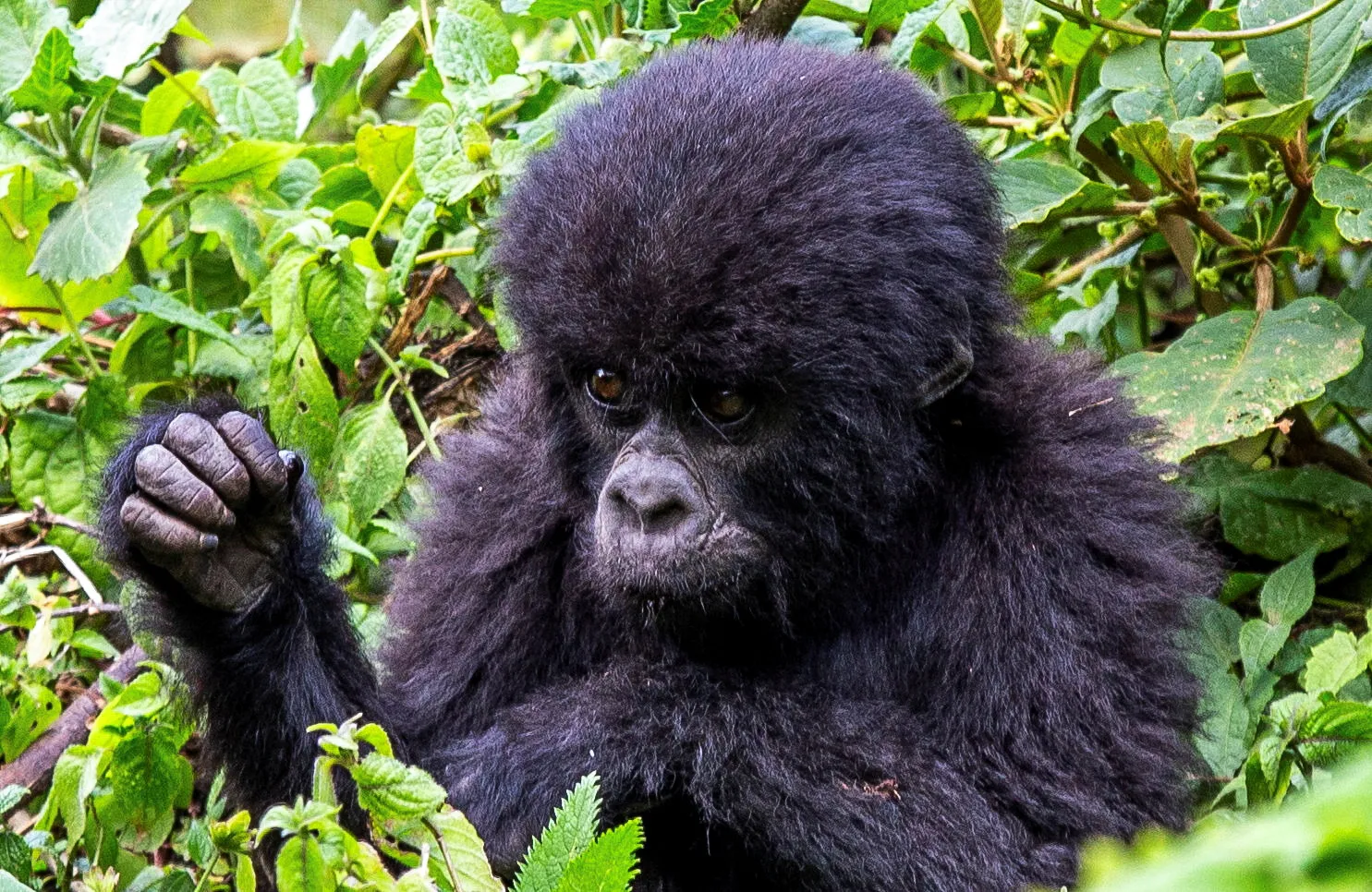 An endangered high mountain baby gorilla is seen in the forest within the Volcanoes National Park near Kinigi, Musanze District, Rwanda on August 31, 2023. (Photo by Jean Bizimana/Reuters)