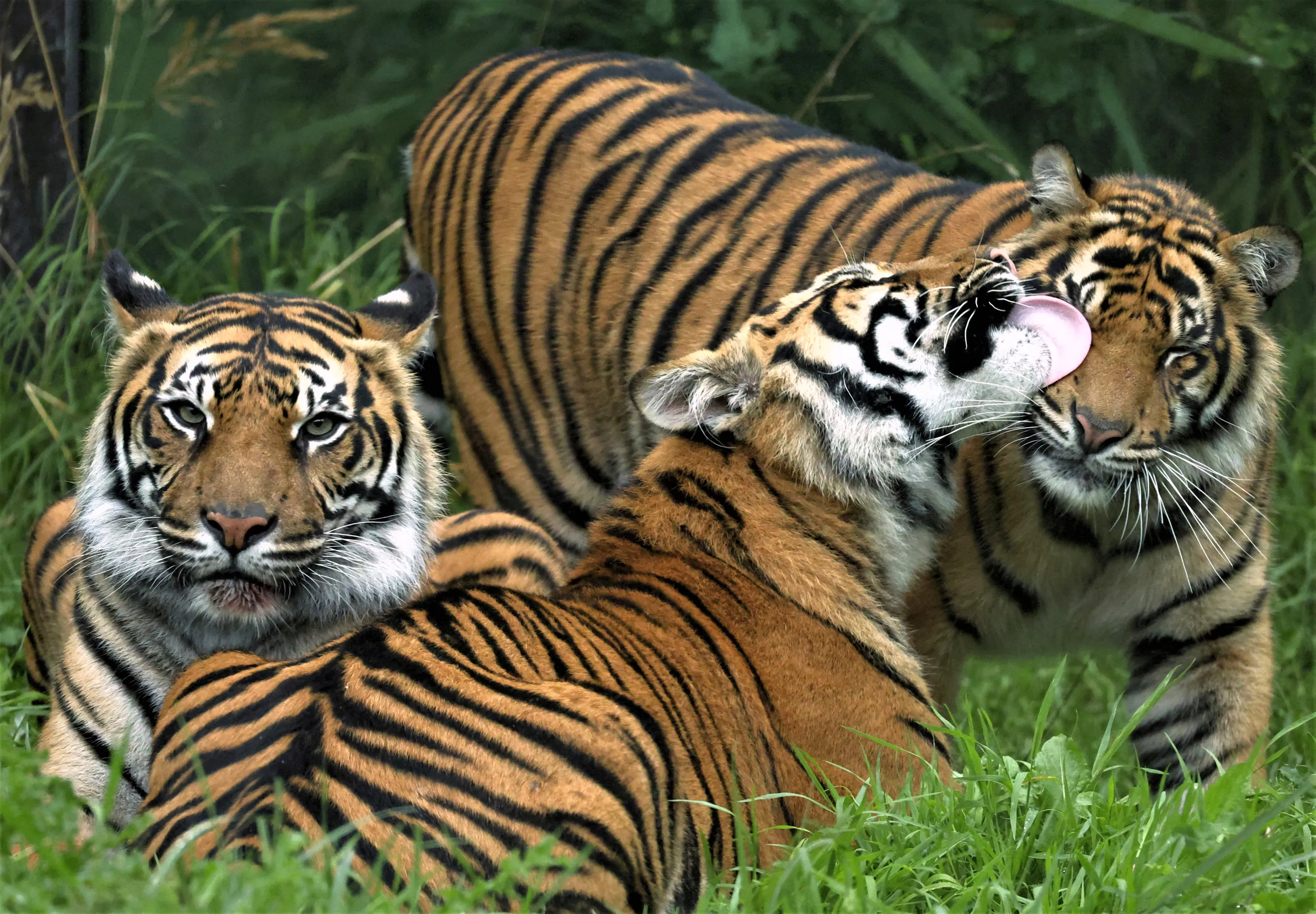 A Sumatran tiger cub, successfully bred as part of a conservation programme at London Zoo, cleans one of its parents during the annual weigh-in to document the health and condition of animals at London Zoo, in London, Britain on August 24, 2023. (Photo by Toby Melville/Reuters)