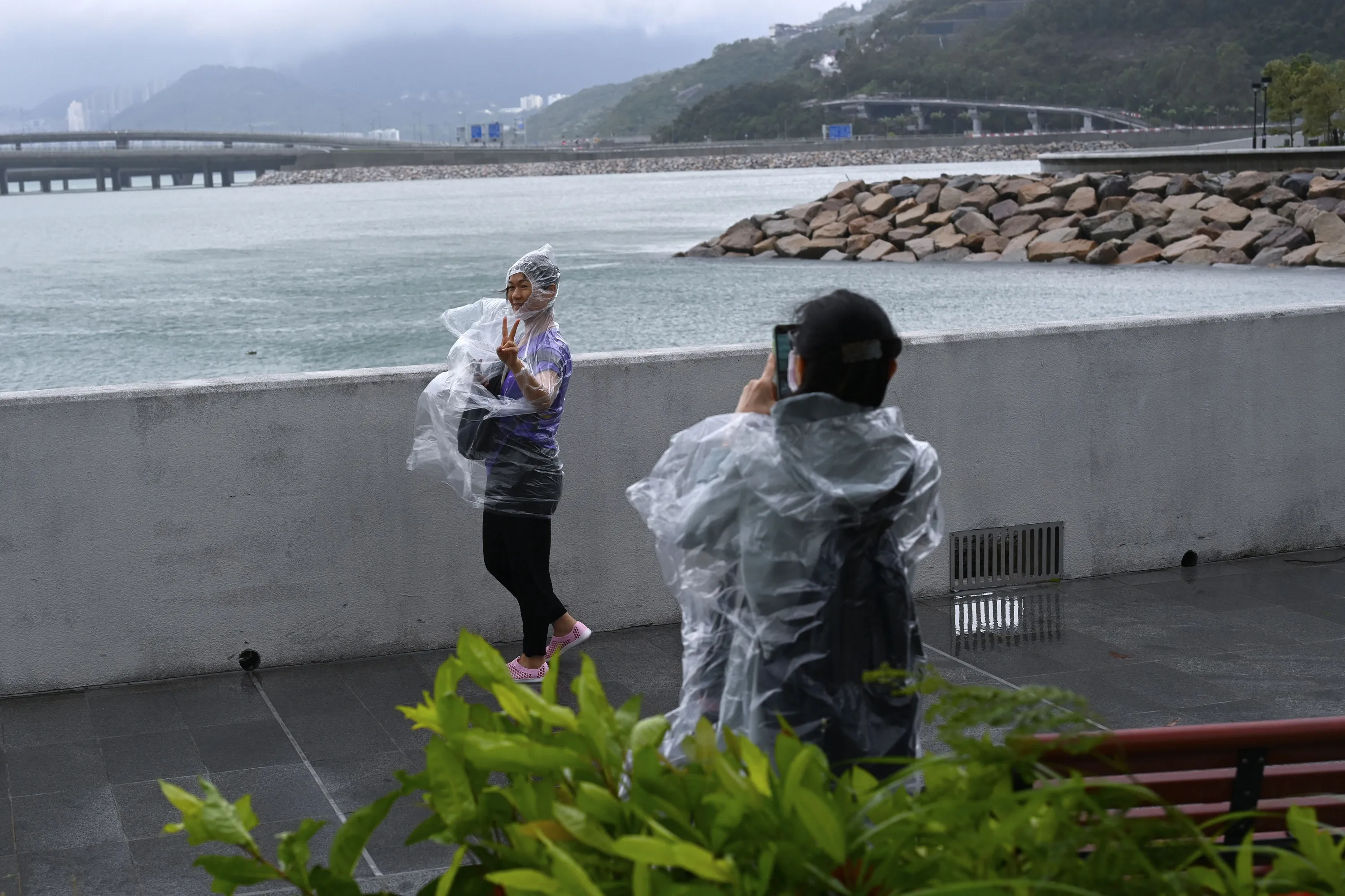 People pose for photographs in the wind during Typhoon Saola in Tseung kwan O, in Hong Kong on Saturday, September 2, 2023. Typhoon Saola made landfall in southern China before dawn Saturday after nearly 900,000 people were moved to safety and most of Hong Kong and other parts of coastal southern China suspended business, transport and classes. (Photo by Billy H.C. Kwok/AP Photo)