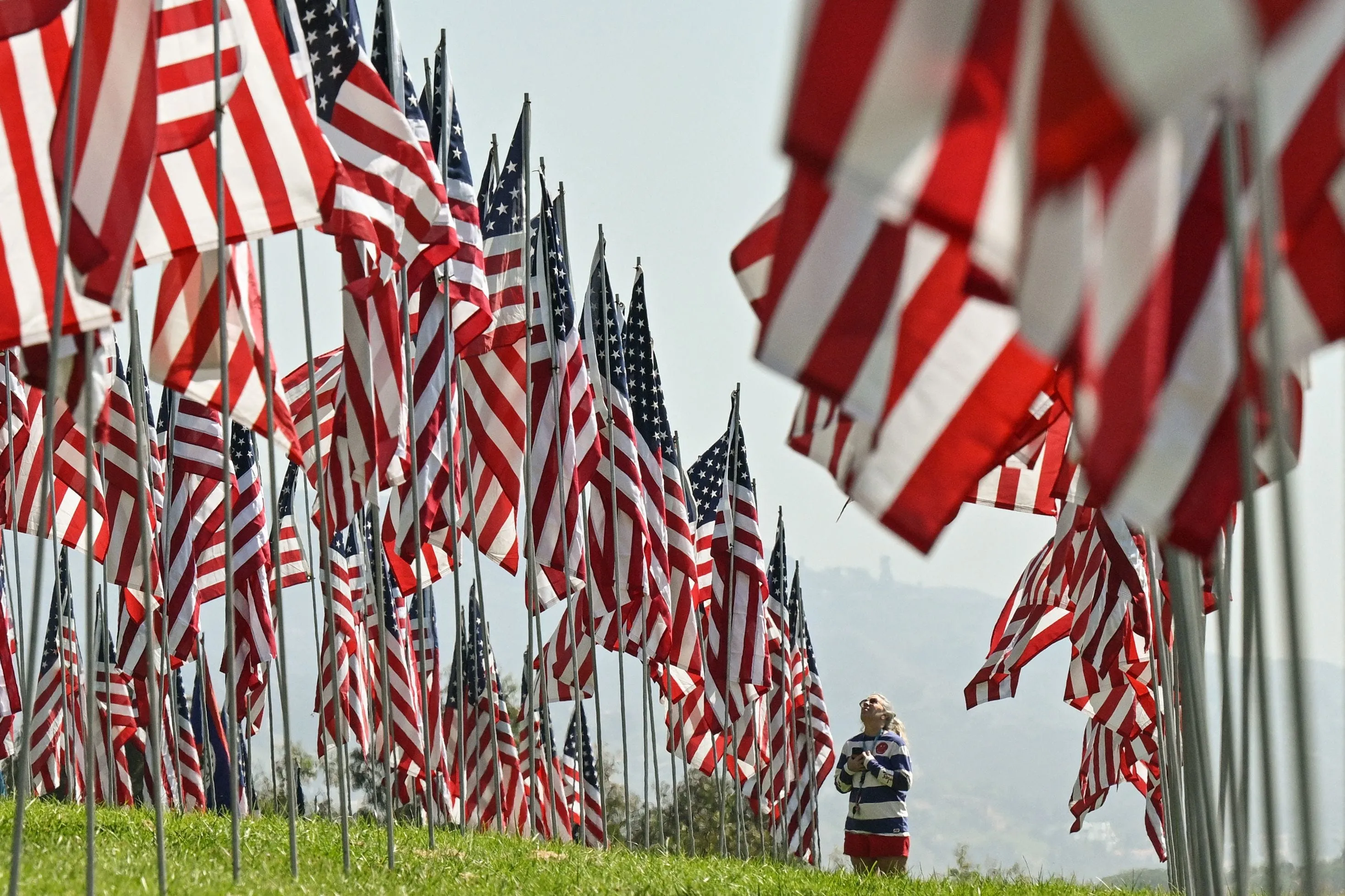 A visitor looks up at some of the nearly 3,000 flags representing the victims of the September 11, 2001 terrorist attacks on the campus of Pepperdine University on September 8, 2023 in Malibu, California. US President Joe Biden will observe the 22nd anniversary of the worst terrorist attack on US soil with an observance at an Alaska military base. (Photo by Robyn Beck/AFP Photo)