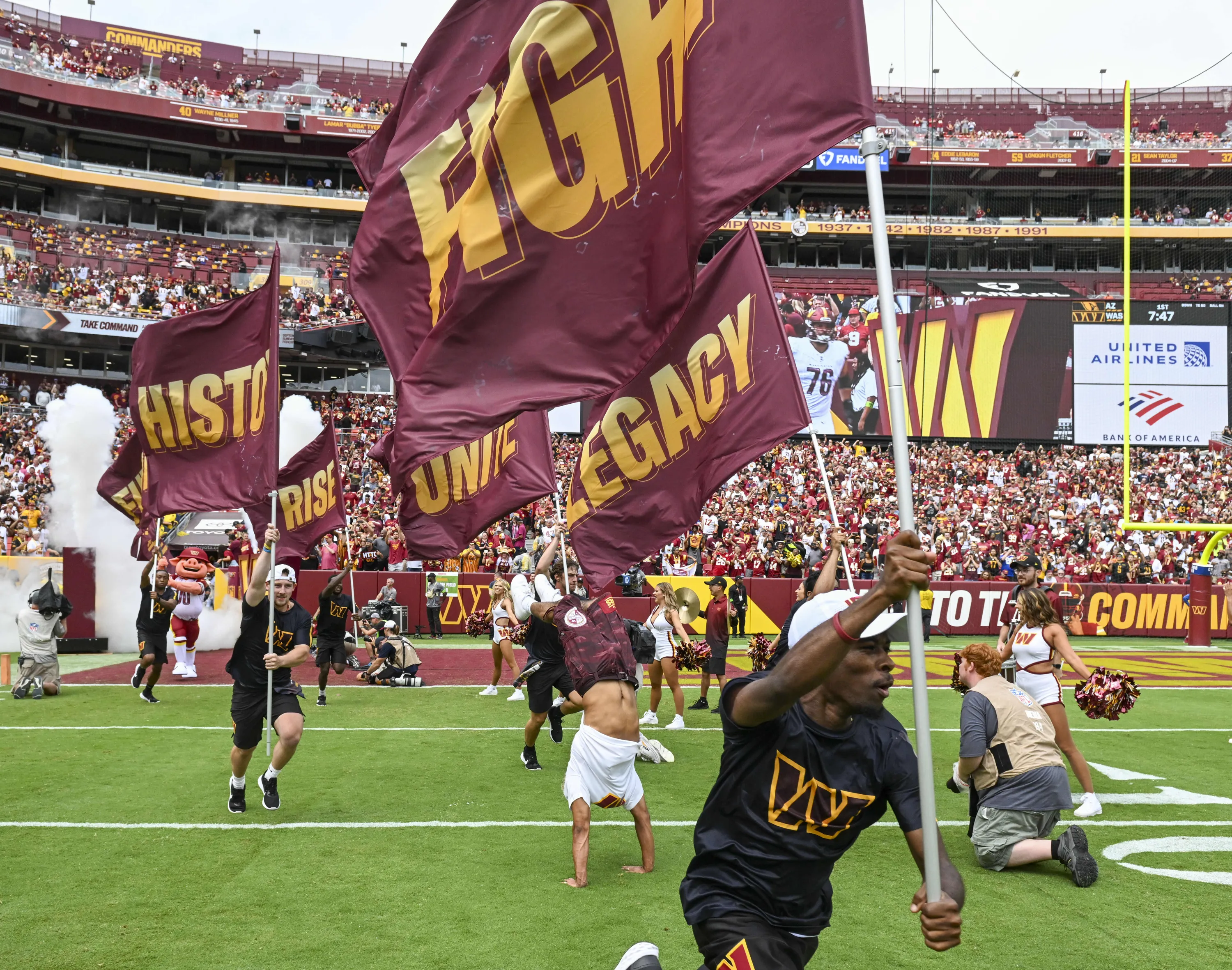 The cheer squad takes the field prior to opening day action between the Arizona Cardinals and Washington Commanders at FedEx field on September 10, 2023. (Photo by Jonathan Newton/The Washington Post)