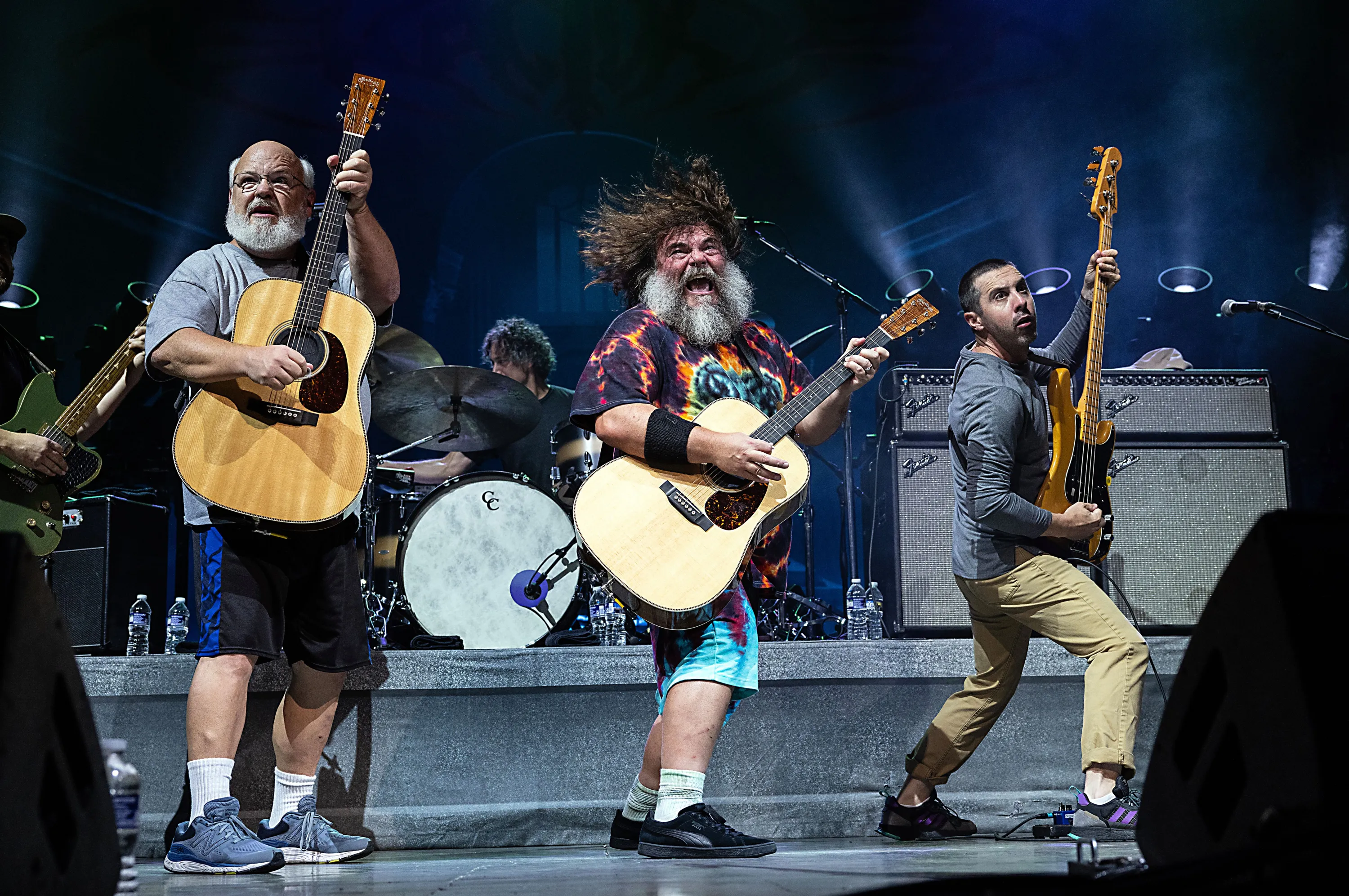 (L-R) Kyle Gass, Jack Black and bassist John Spiker of comedy rock duo Tenacious D perform at PNC Music Pavilion on September 06, 2023 in Charlotte, North Carolina. (Photo by Jeff Hahne/Getty Images)