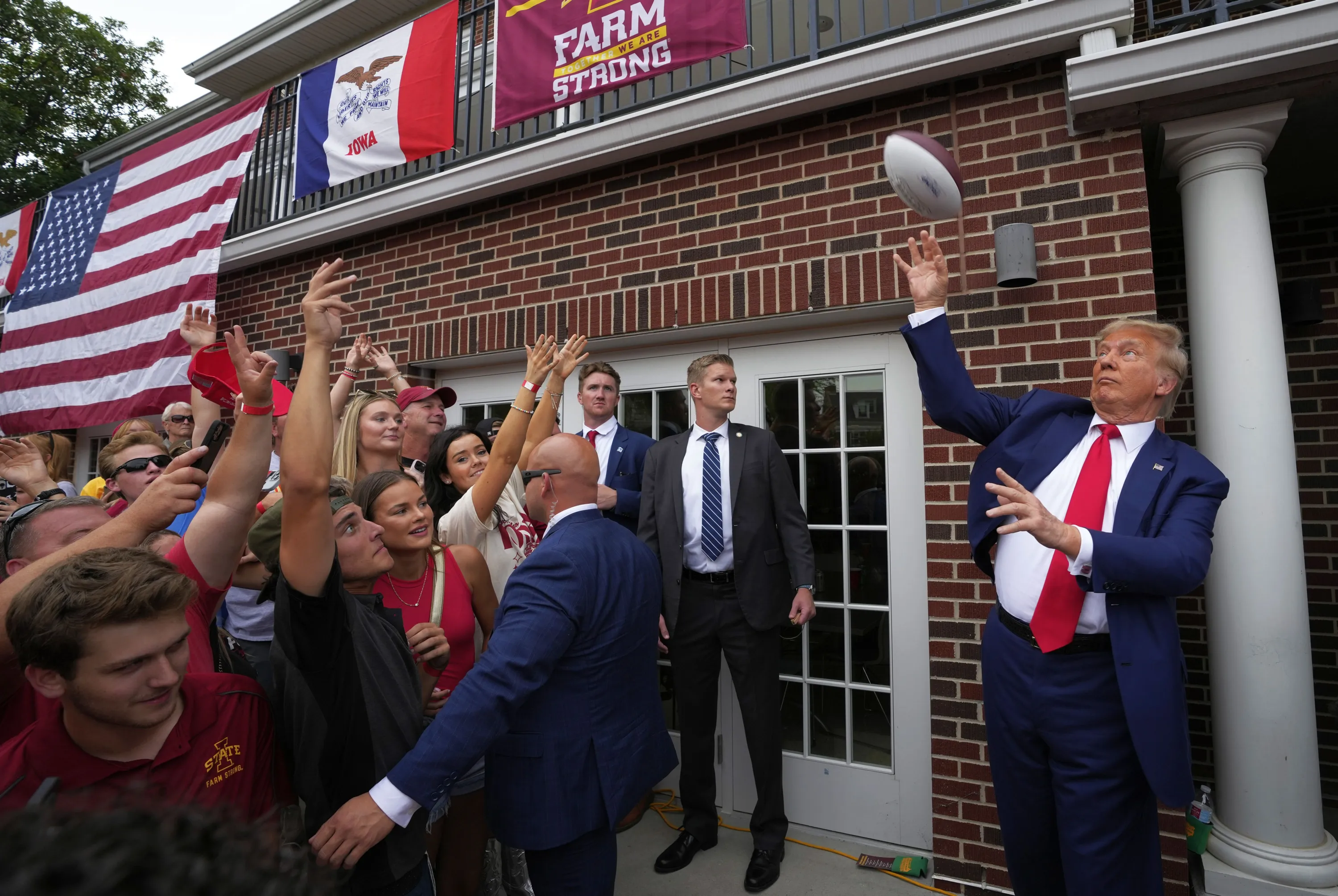 Former President Donald Trump throws a football to the crowd during a visit to the Alpha Gamma Rho, agricultural fraternity, at Iowa State University before an NCAA college football game between Iowa State and Iowa, Saturday, September 9, 2023, in Ames, Iowa. (Photo by Charlie Neibergall/AP Photo)
