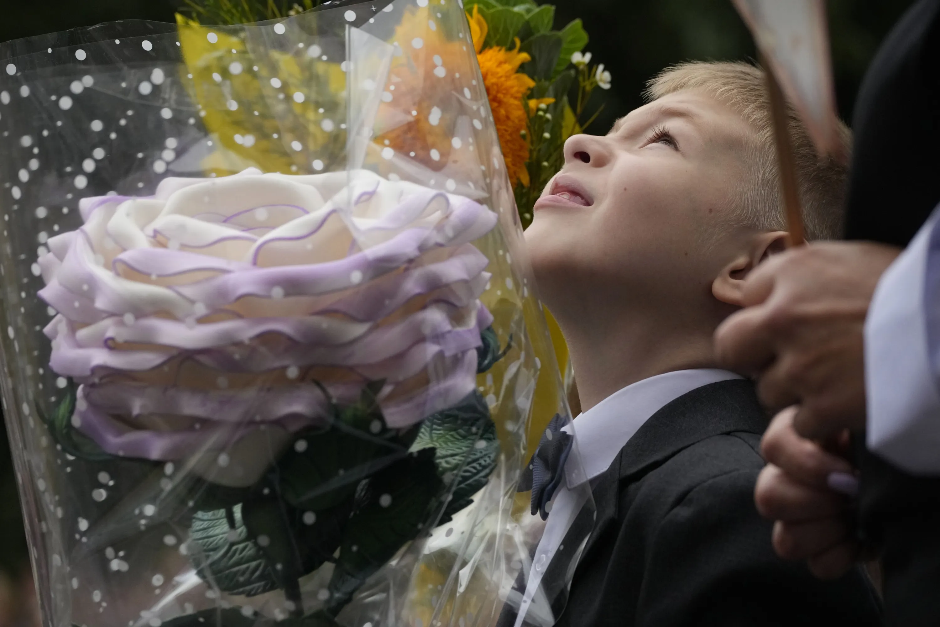 A first grader takes part in a ceremony marking the start of classes at a school as part of the traditional opening of the school year known as “Day of Knowledge” in St. Petersburg, Russia, Friday, September 1, 2023. (Photo by Dmitri Lovetsky/AP Photo)