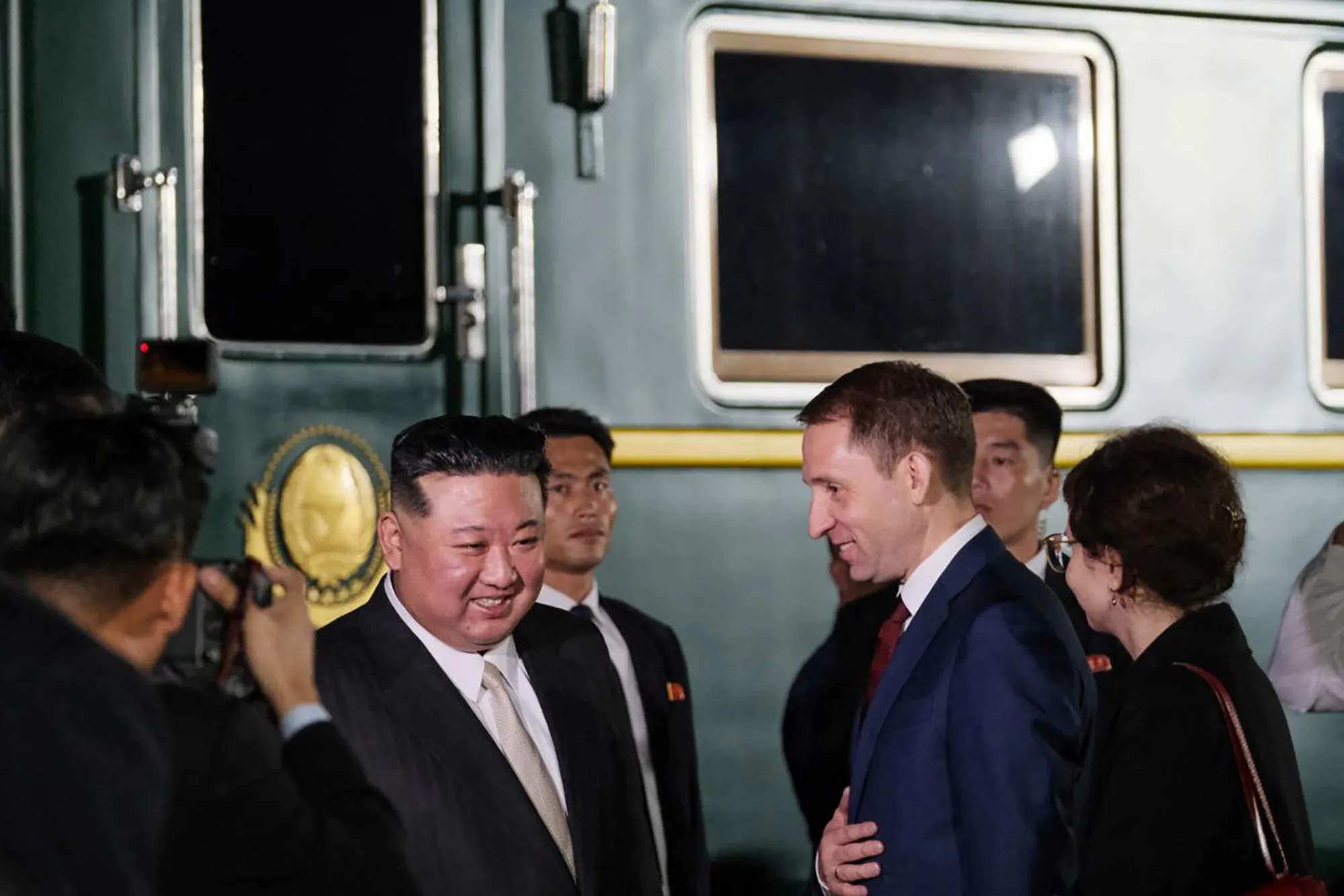 This handout photograph taken and released by Ministry of Natural Resources and Environment of Russia on September 12, 2023, shows North Korea's leader Kim Jong Un (C,L) welcomed by Russia's Minister of Natural Resources and Environment Alexander Kozlov (C,R) upon his arrival at Khasan train station, Primorky region, at the start of his official visit to Russia. North Korean leader Kim Jong Un arrived in Russia on September 12, 2023 ahead of a meeting with President Vladimir Putin that the United States has warned could see an arms deal to support Moscow's assault on Ukraine. (Photo by Handout/Russian Environment Ministry/AFP Photo)
