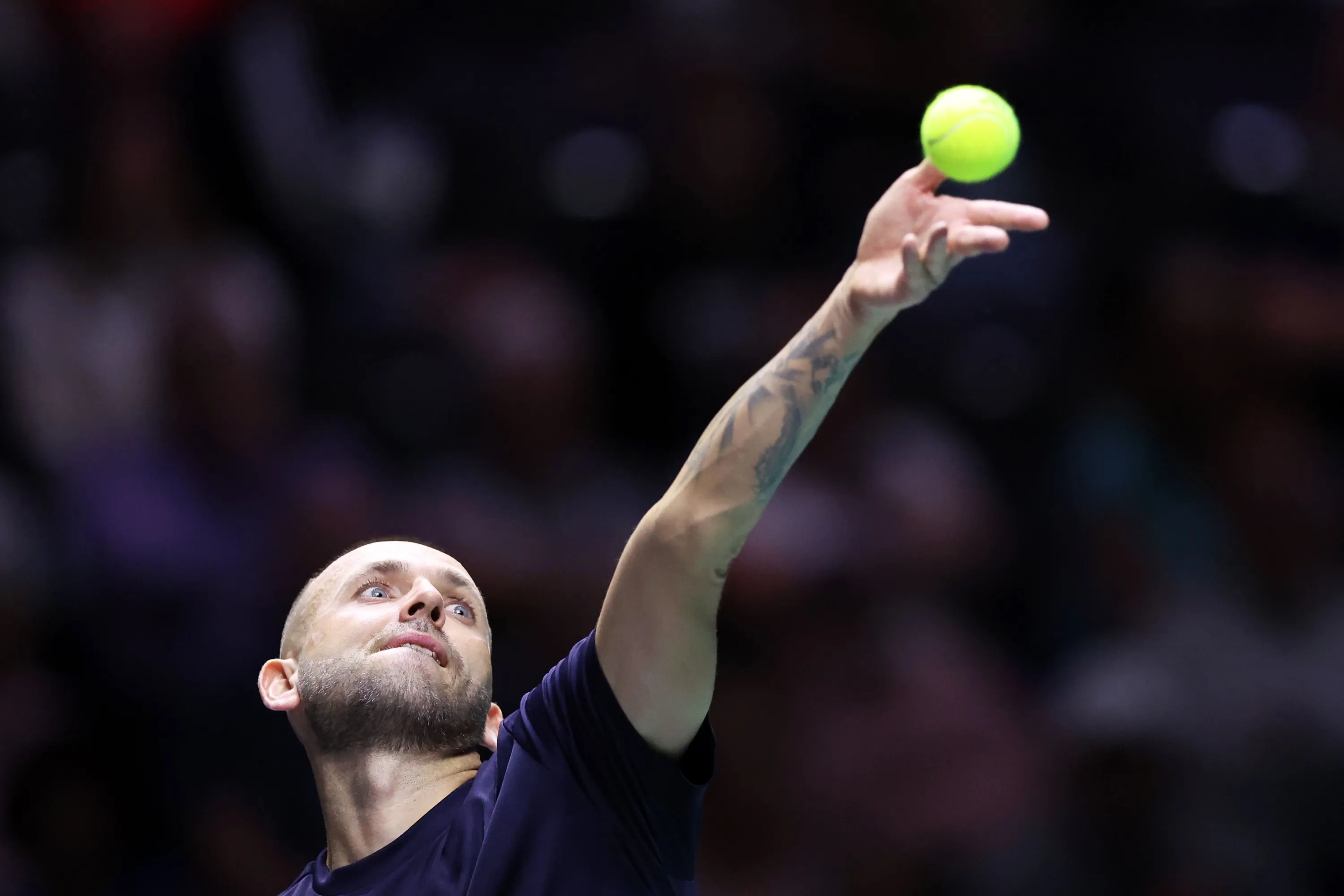 Daniel Evans of Great Britain serves in the Australia v Great Britain Match 2 against Alex De Minaur of Australia during day two of the Davis Cup Finals Group Stage Manchester at AO Arena on September 13, 2023 in Manchester, England. (Photo by Nathan Stirk/Getty Images for LTA)