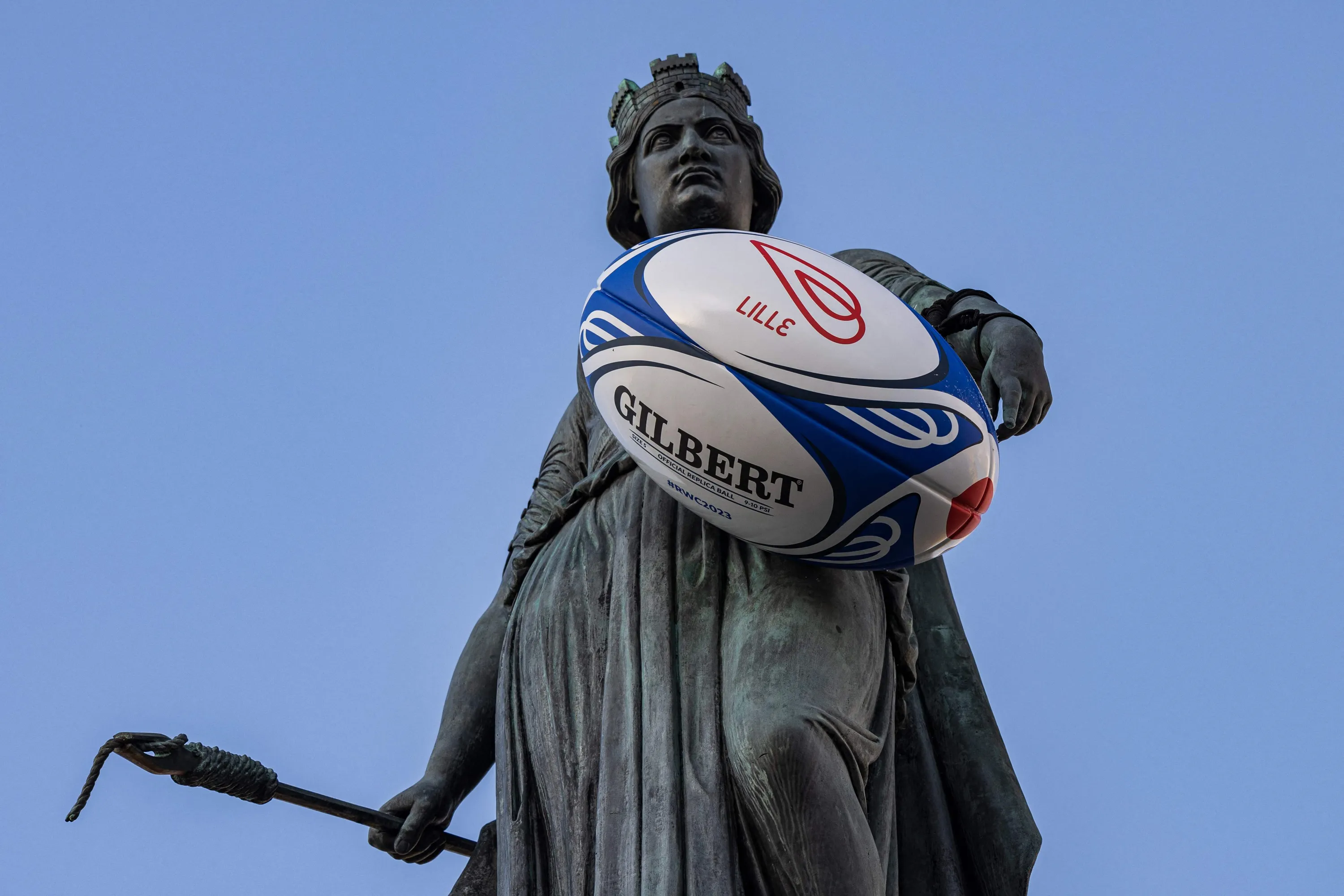 A huge rugby ball is installed on the Column of the Goddess statue, a Memorial monument for the Siege of Lille in 1792 located in the Grand'Place square in Lille, on September 13, 2023, during the France 2023 Rugby World Cup. (Photo by Sameer Al-Doumy/AFP Photo)