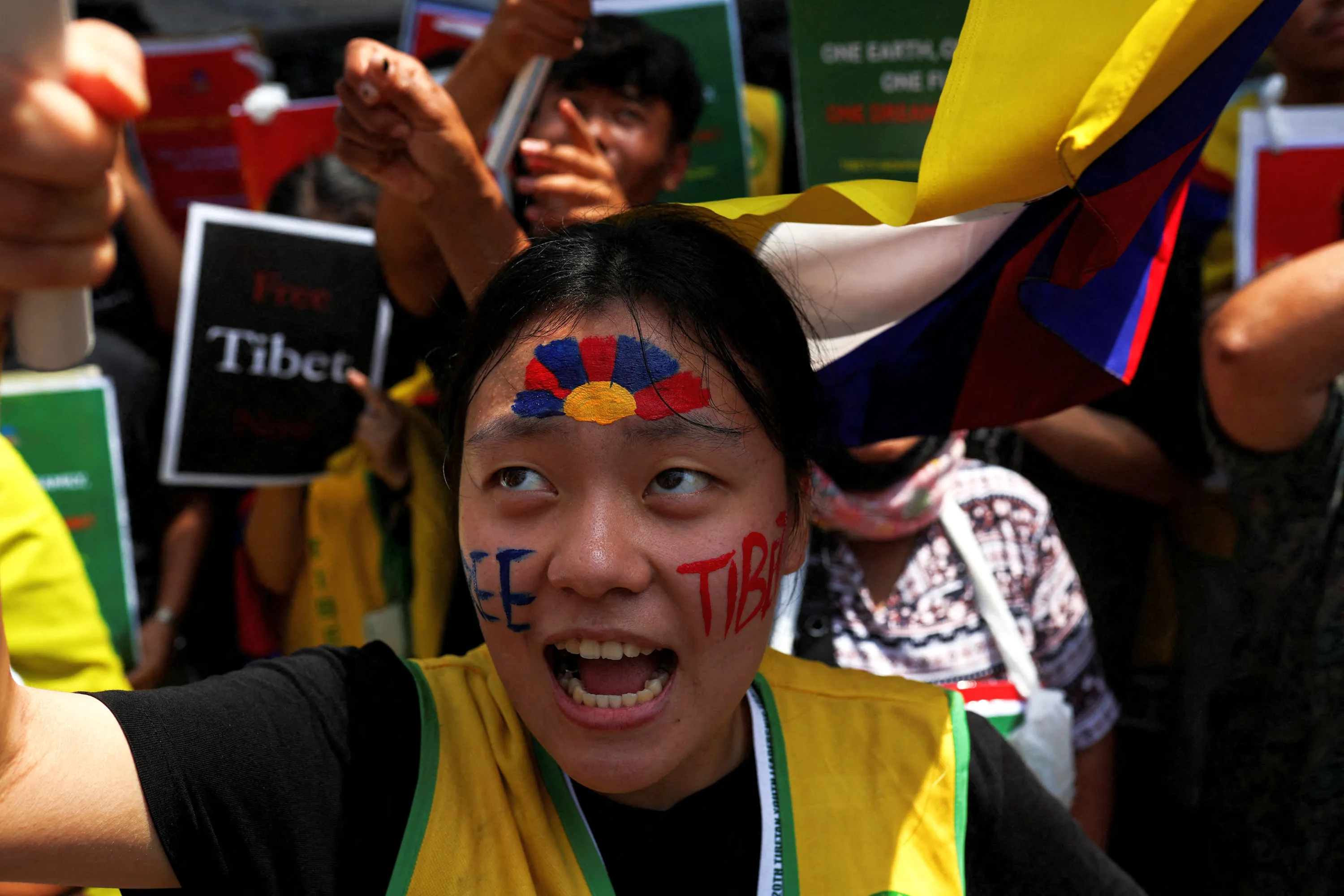 A member of the Tibetan community protests against the Chinese government at their refugee colony in Majnu ka Tilla ahead of the G20 summit in New Delhi, India on September 8, 2023. (Photo by Anushree Fadnavis/Reuters)