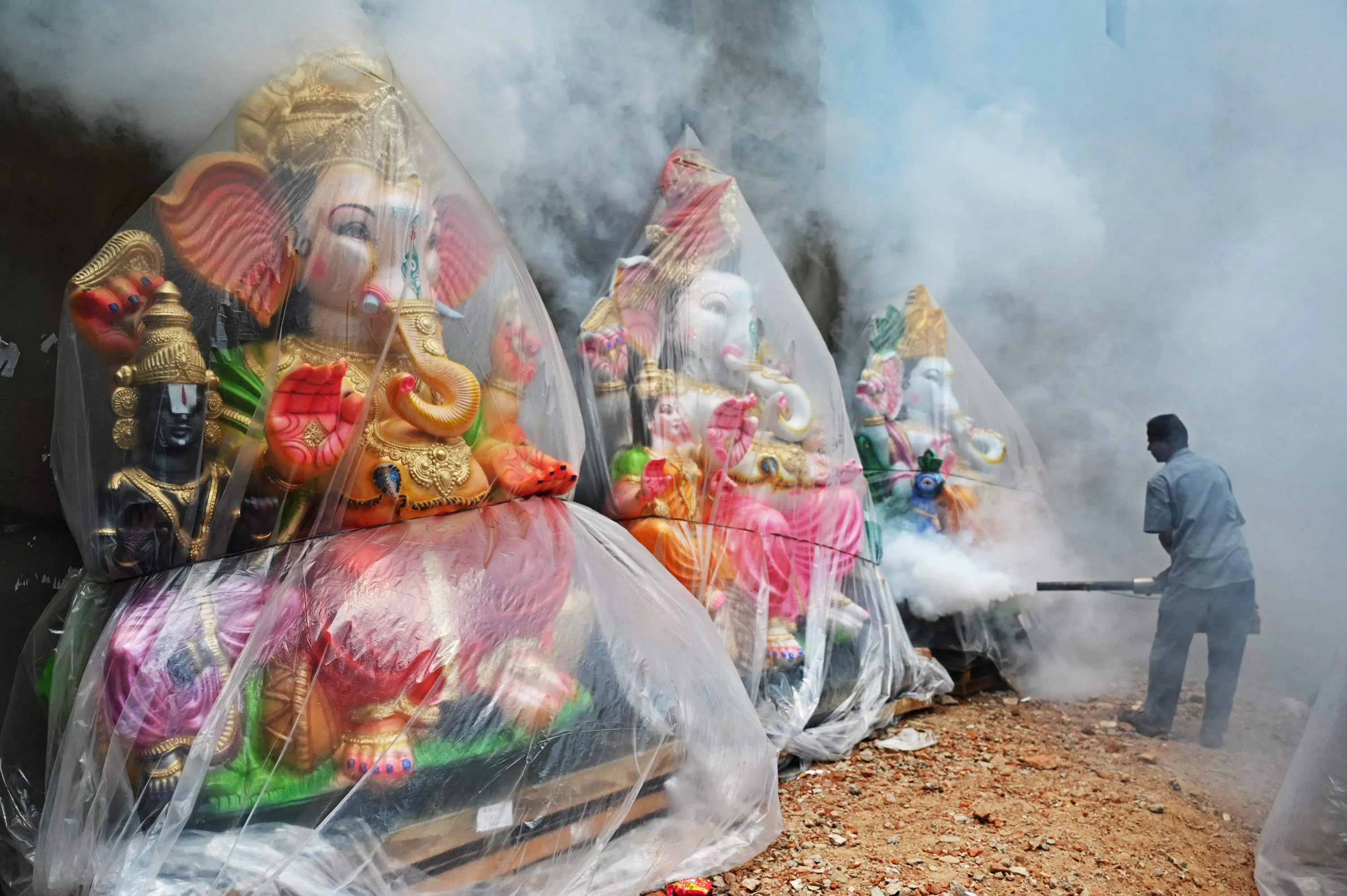 A municipal worker fumigates a housing colony as a preventive measure against mosquito-borne diseases next to idols of the elephant-headed Hindu deity “Ganesha” ahead of the Ganesh Chaturthi festival in Chennai on September 13, 2023. (Photo by R. Satish Babu/AFP Photo)
