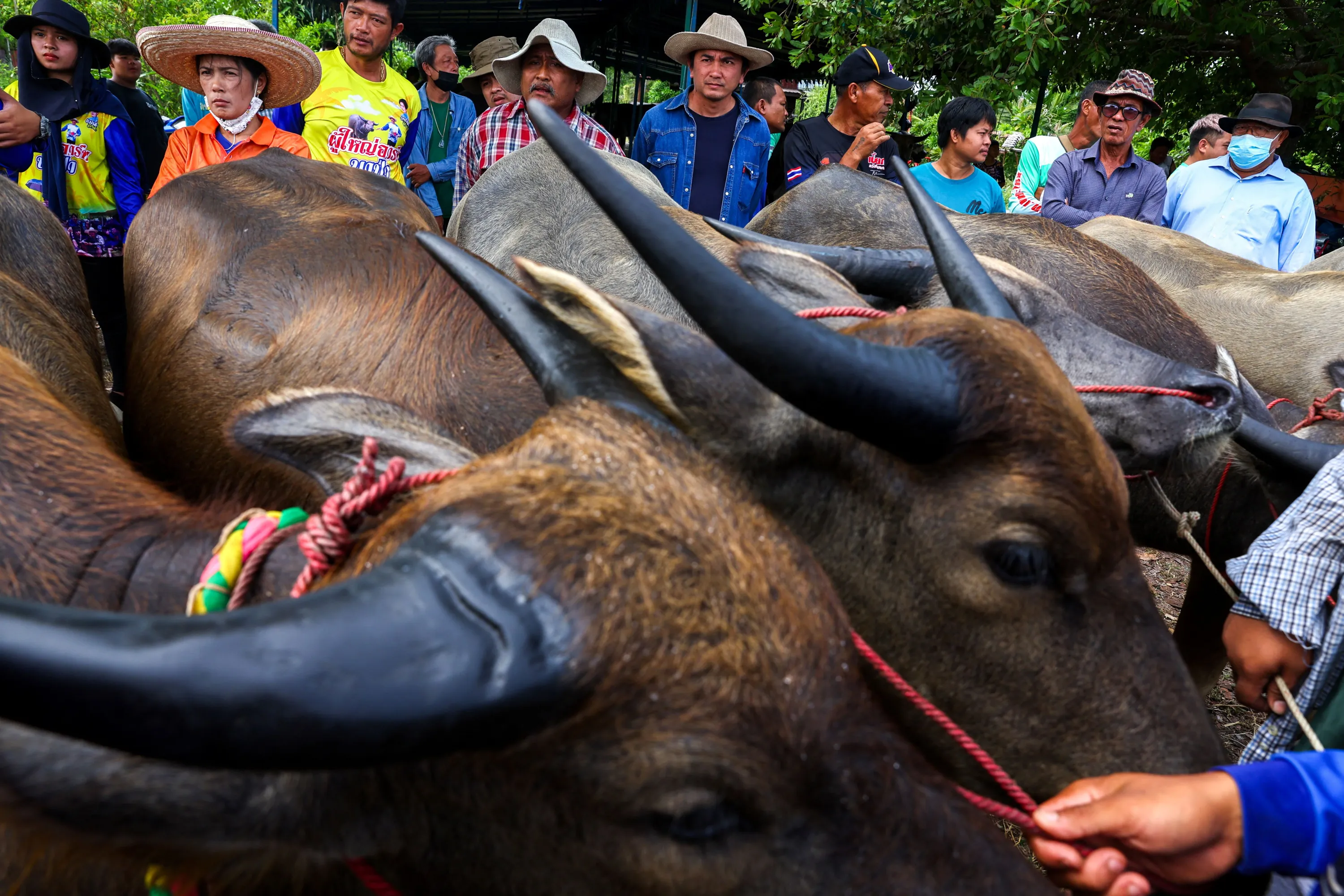 Water buffalos and owners gather before the start of Chonburi's annual buffalo race festival, in Chonburi province, Thailand on August 6, 2023. (Photo by Athit Perawongmetha/Reuters)