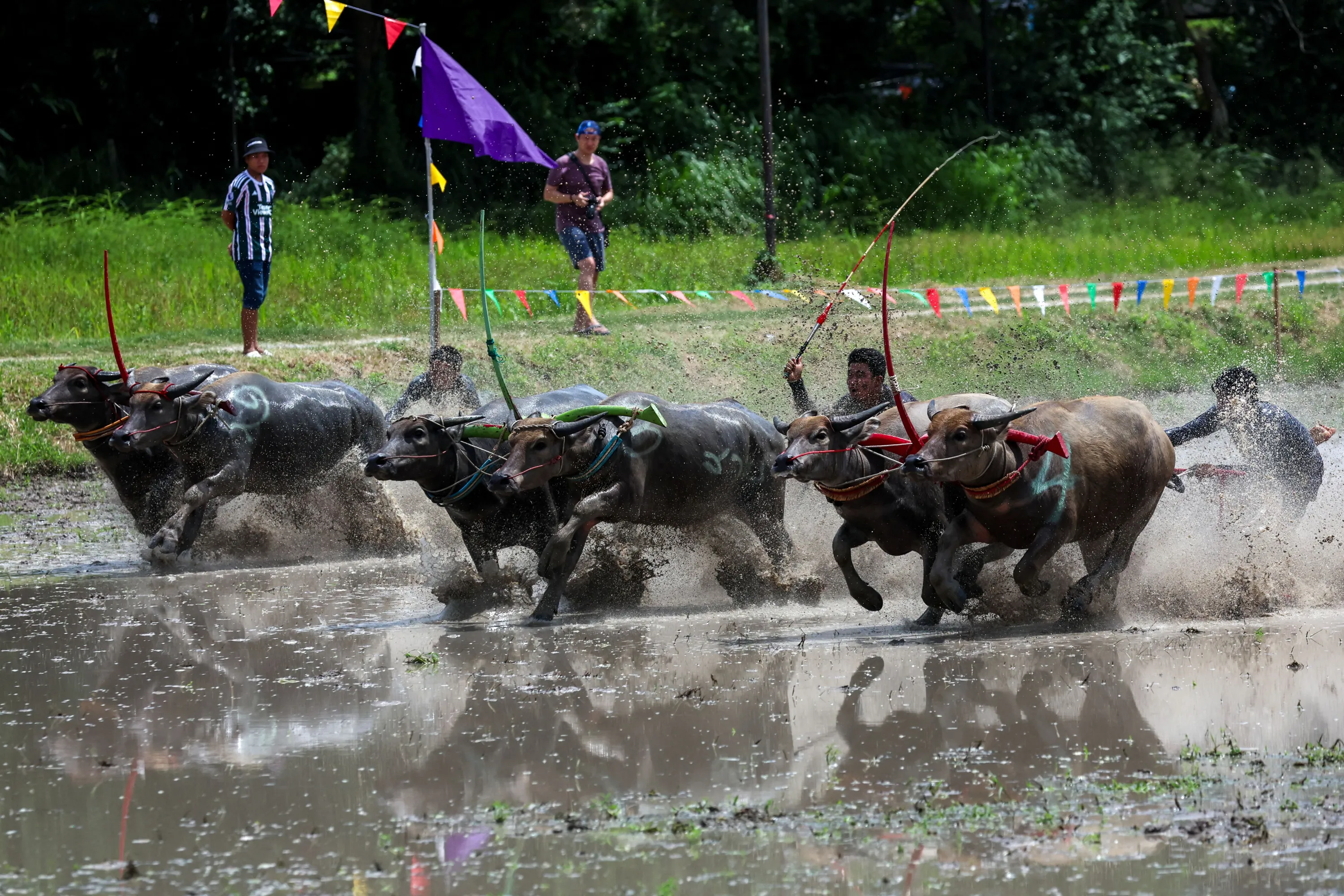 Jockeys compete in Chonburi's annual buffalo race festival, Chonburi province, Thailand on August 6, 2023. (Photo by Athit Perawongmetha/Reuters)