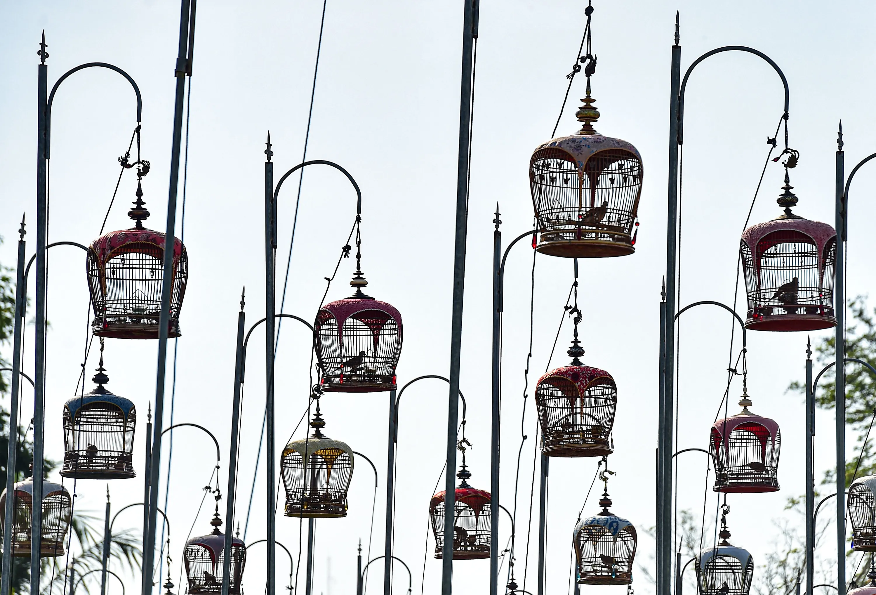 Birds sit in cages during a bird singing competition in Thailand's southern province of Narathiwat on September 18, 2023. Some 2,000 birds from Thailand, Malaysia and Singapore were entered in the annual contest. (Photo by Madaree Tohlala/AFP Photo)