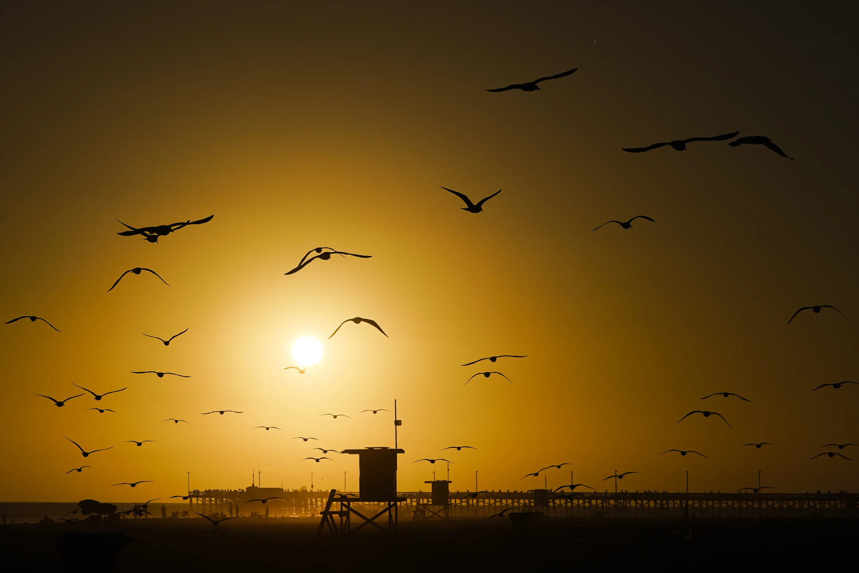 Seagulls fly as the sun sets Tuesday, September 12, 2023, in Newport Beach, Calif. (Photo by Ryan Sun/AP Photo)