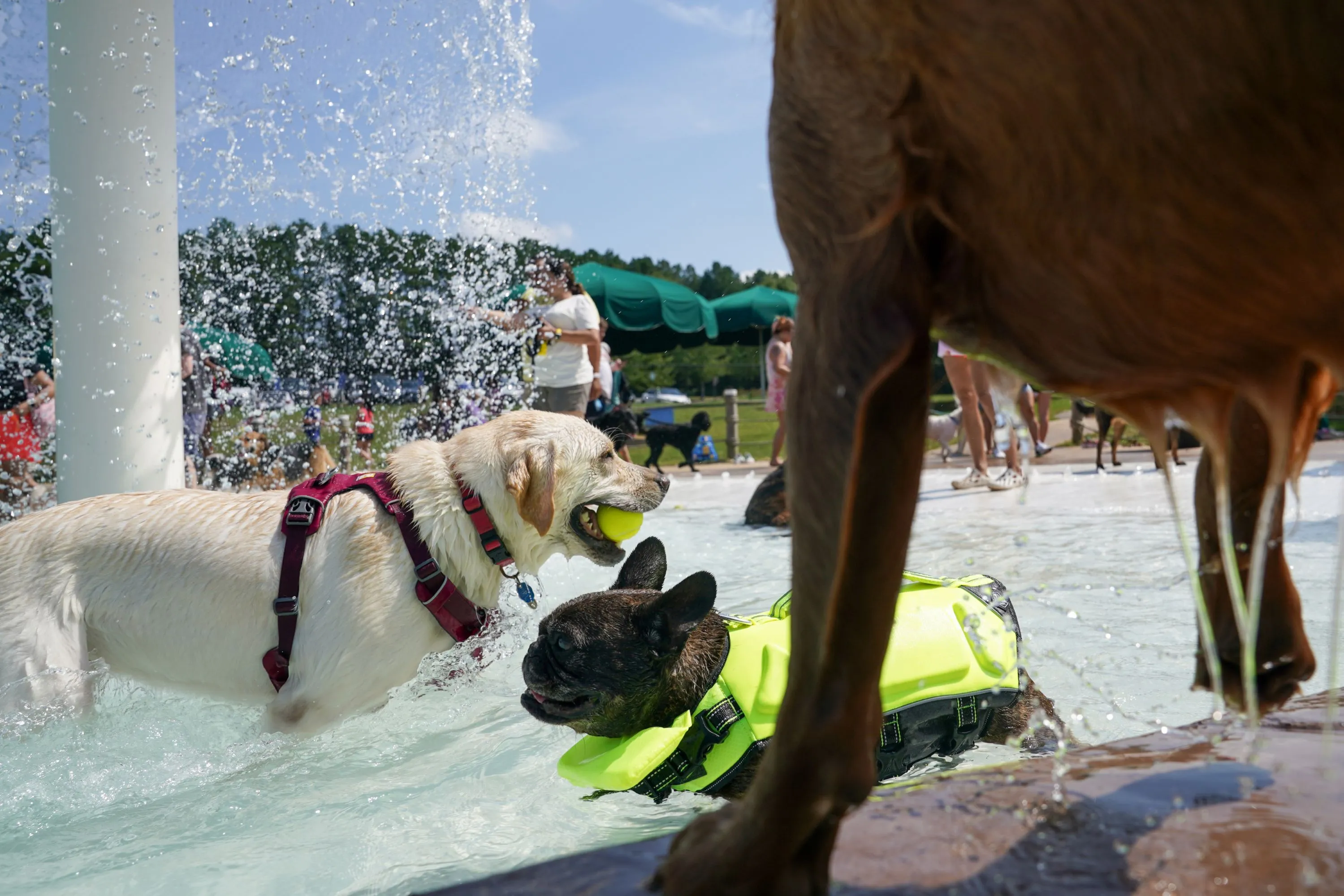 Dogs get the pool mostly to themselves for the annual Dog Daze event at the Water Mine Family Swimmin’ Hole in Lake Fairfax Park on September 9, 2023, in Reston, VA. The event ends swimming pool season in Fairfax County. (Photo by Jahi Chikwendiu/The Washington Post)