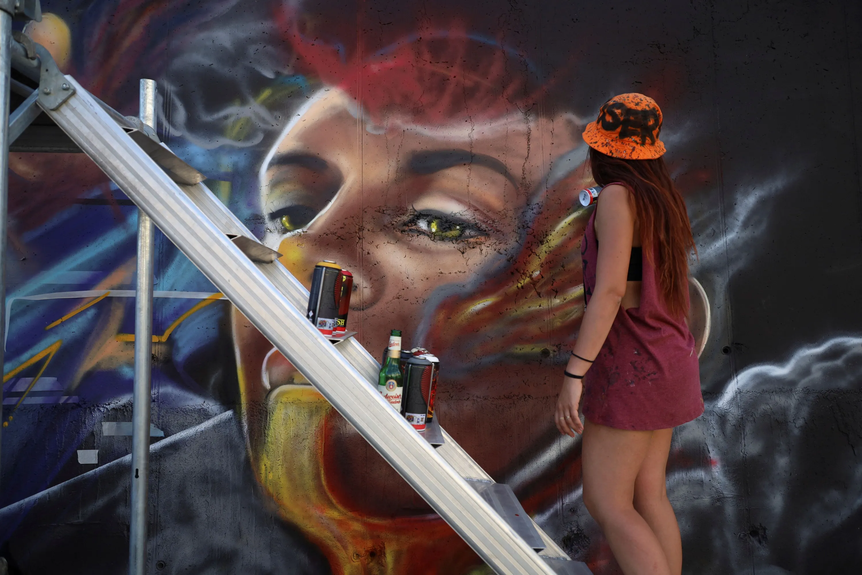 Liliana Demitri, a graffiti artist from Italy, paints a mural as part of the Meeting of Styles graffiti festival in Kosovo's capital Pristina, Kosovo on July 28, 2023. (Photo by Fatos Bytyci/Reuters)