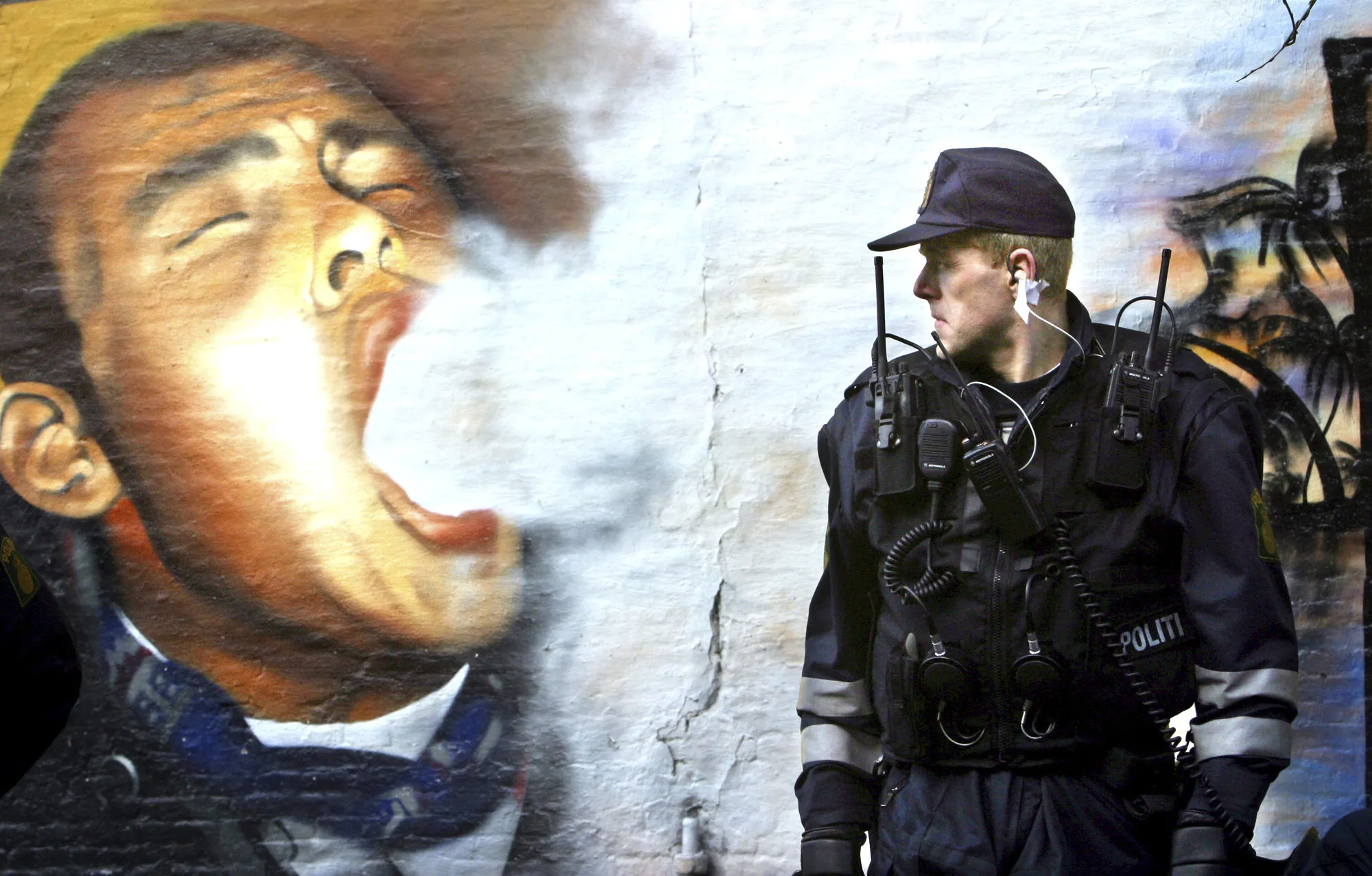 In this Tuesday, March 16, 2004 file photo, a member of the Copenhagen police patrols the enclave of Christiania in Copenhagen, Denmark. Copenhagen’s mayor is urging urged foreigners not to buy weed in a the city's Christiania neighborhood known for its flourishing hashish trade where a 30-year-old man was killed by shots last month and four people injured. (Photo by John McConnico/AP Photo)