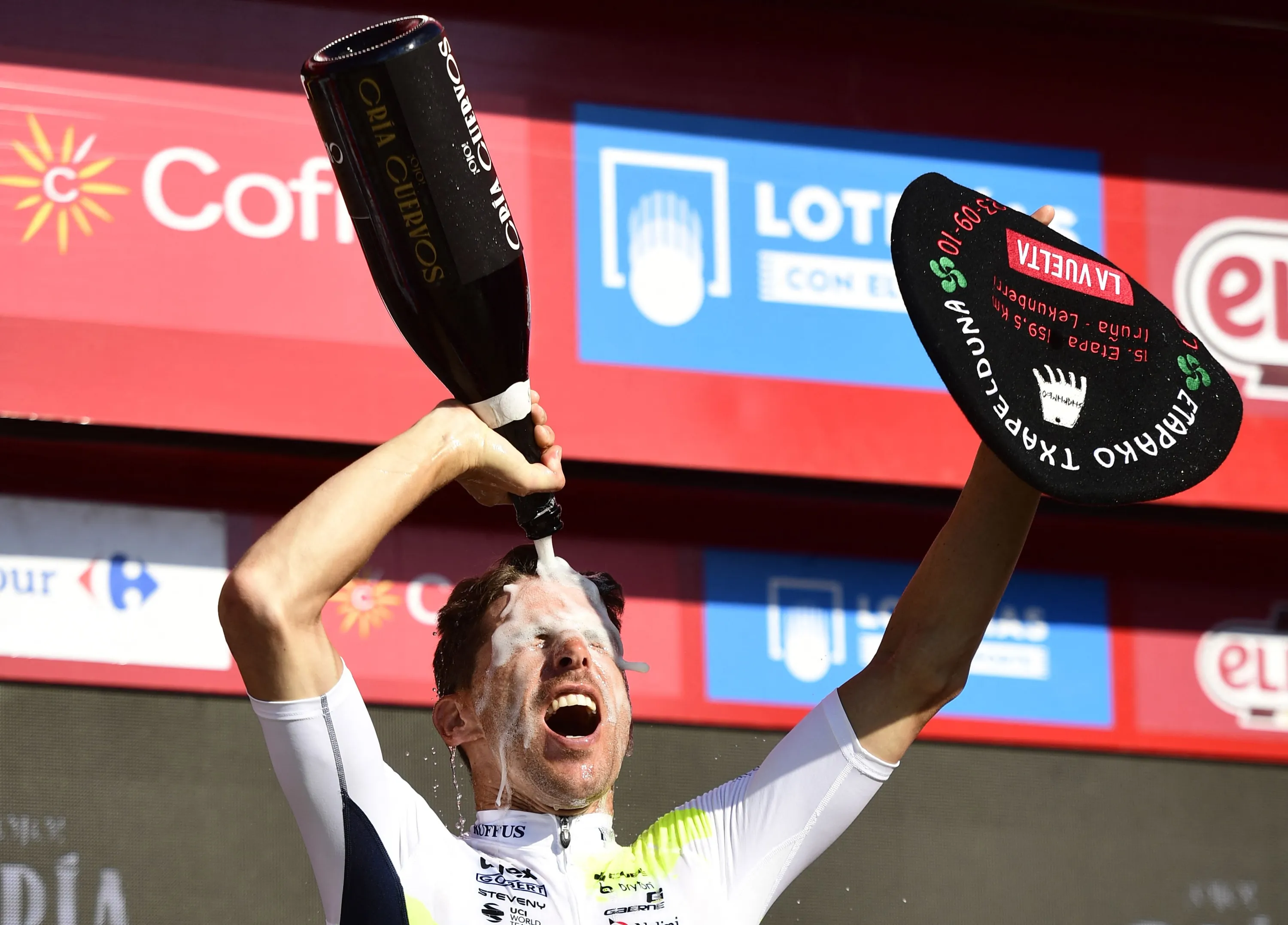 Team Intermarche Wanty's Portuguese rider Rui Costa celebrates on the podium winning the stage 15 of the 2023 La Vuelta cycling tour of Spain, a 158,3 km race between Pamplona and Lekunberri on September 10, 2023. (Photo by Ander Gillenea/AFP Photo)