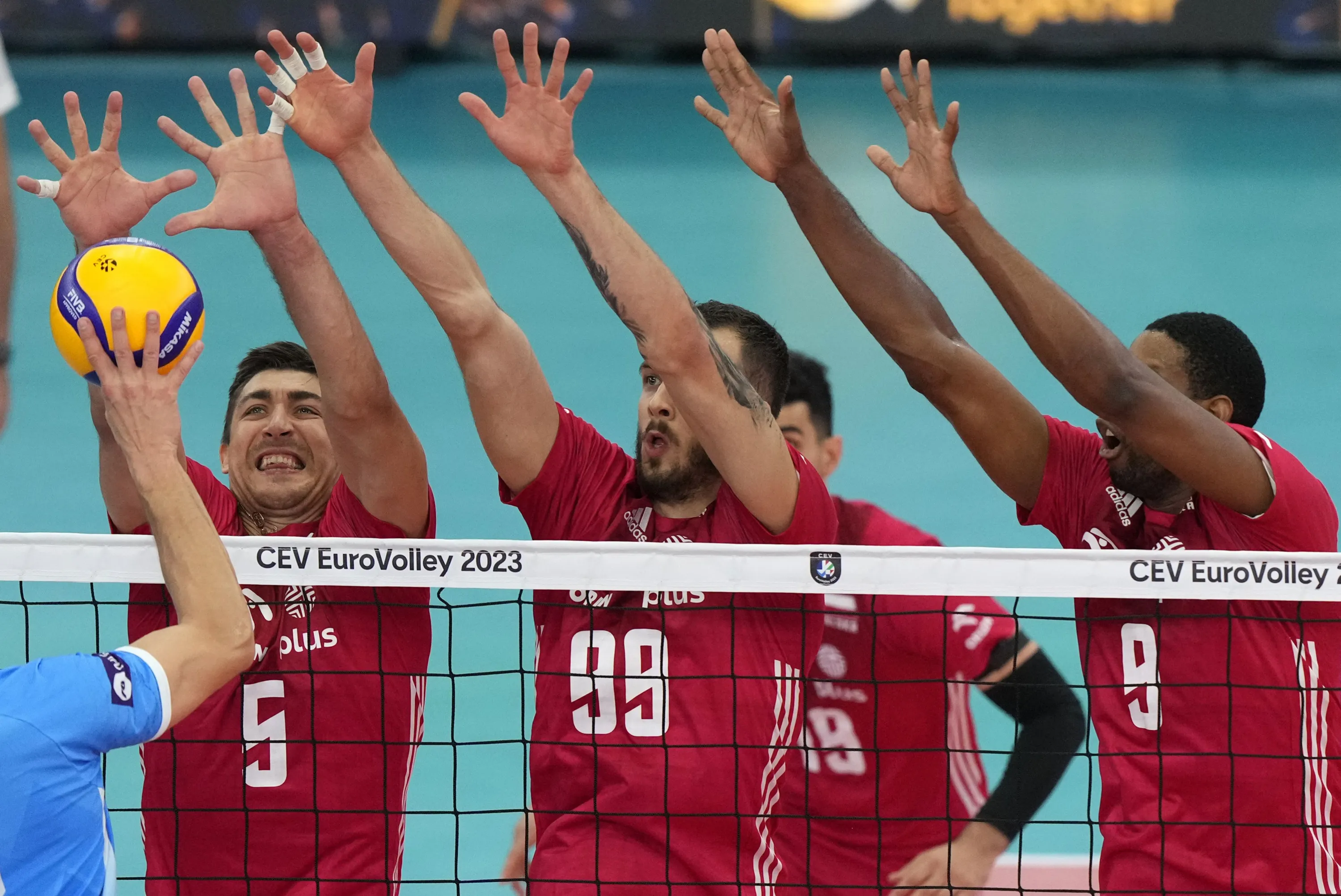 Slovenia's Klemen Cebulj, left, hits the ball over the net as Poland's Lukasz Kaczmarek, Poland's Norbert Huber, Poland's Wilfredo Leon attempt to block during the Men's European Volleyball Championship semifinal match between Poland and Slovenia, in Rome, Thursday, September 14, 2023. (Photo by Andrew Medichini/AP Photo)