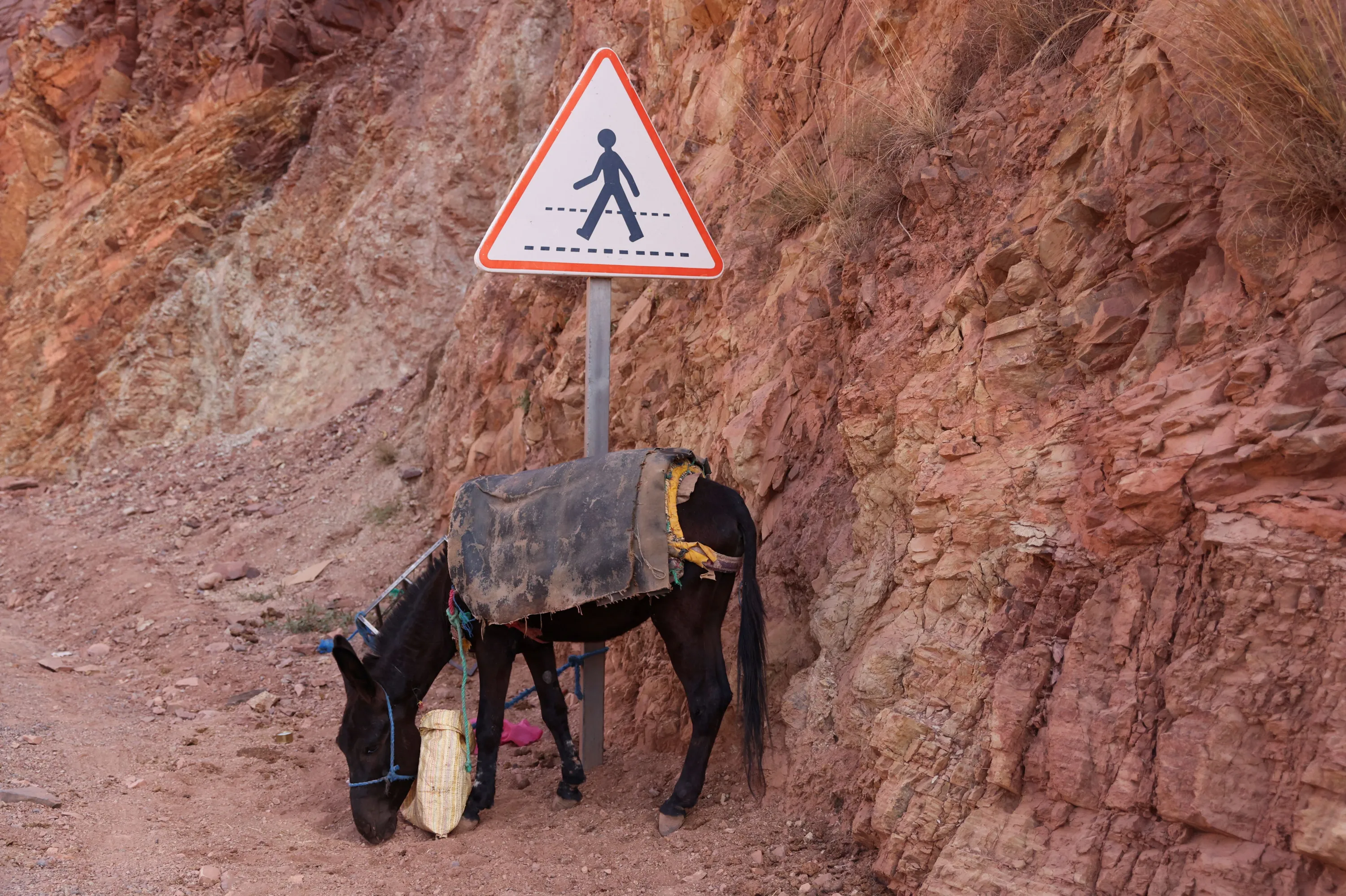 A donkey is seen in the aftermath of a deadly earthquake near the village of Tallat n'Yakoub, Morocco on September 12, 2023. (Photo by Nacho Doce/Reuters)