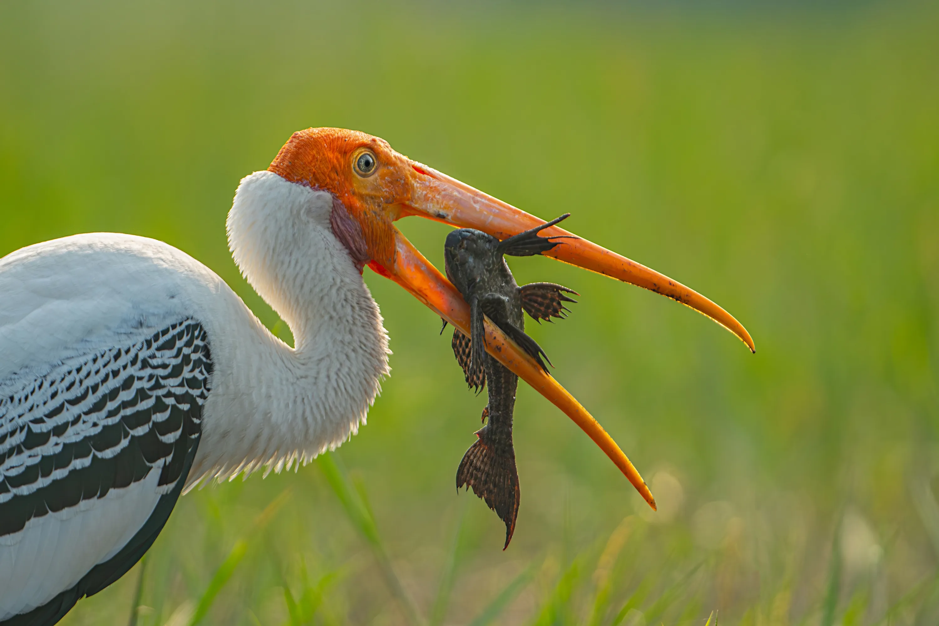 A painted stork with its catch of the day in Bhiwan, India early September 2023. The painted stork is a large wader in the stork family. Their distinctive pink tertian feathers of the adults give them their name. They forage in flocks in shallow waters along rivers or lakes. They immerse their half open beaks in water and sweep them from side to side and snap up their prey of small fish that are sensed by touch. (Photo by Sadananda Koppalkar/Media Drum Images)