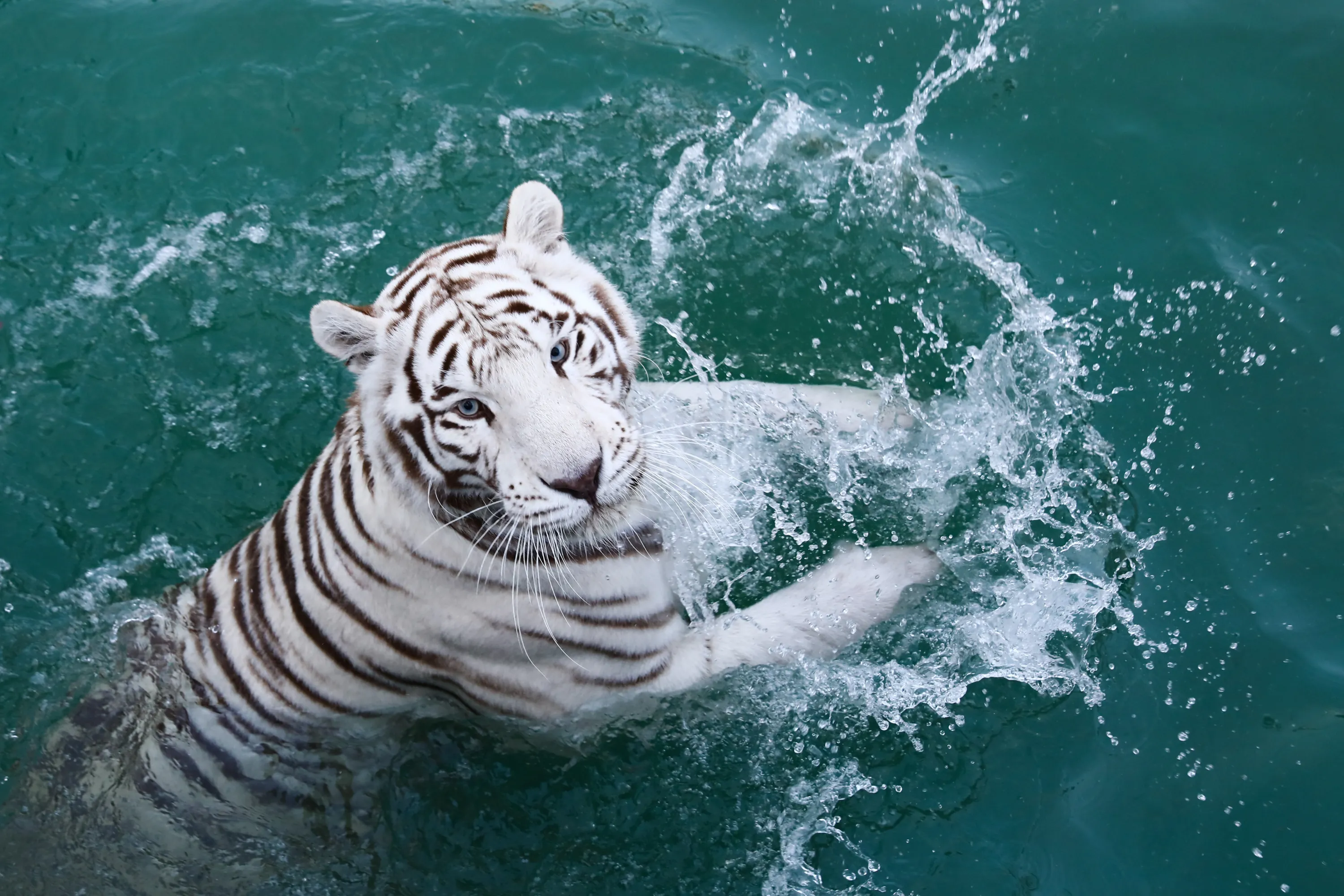 A white Bengal tiger, one of the endangered species, swims in a pool at a zoo in Borysew, Poland on September 10, 2023. The zoo opens a new swimming pool, which is the first one dedicated for these animals in Europe. (Photo by Jakub Porzycki/Anadolu Agency via Getty Images)