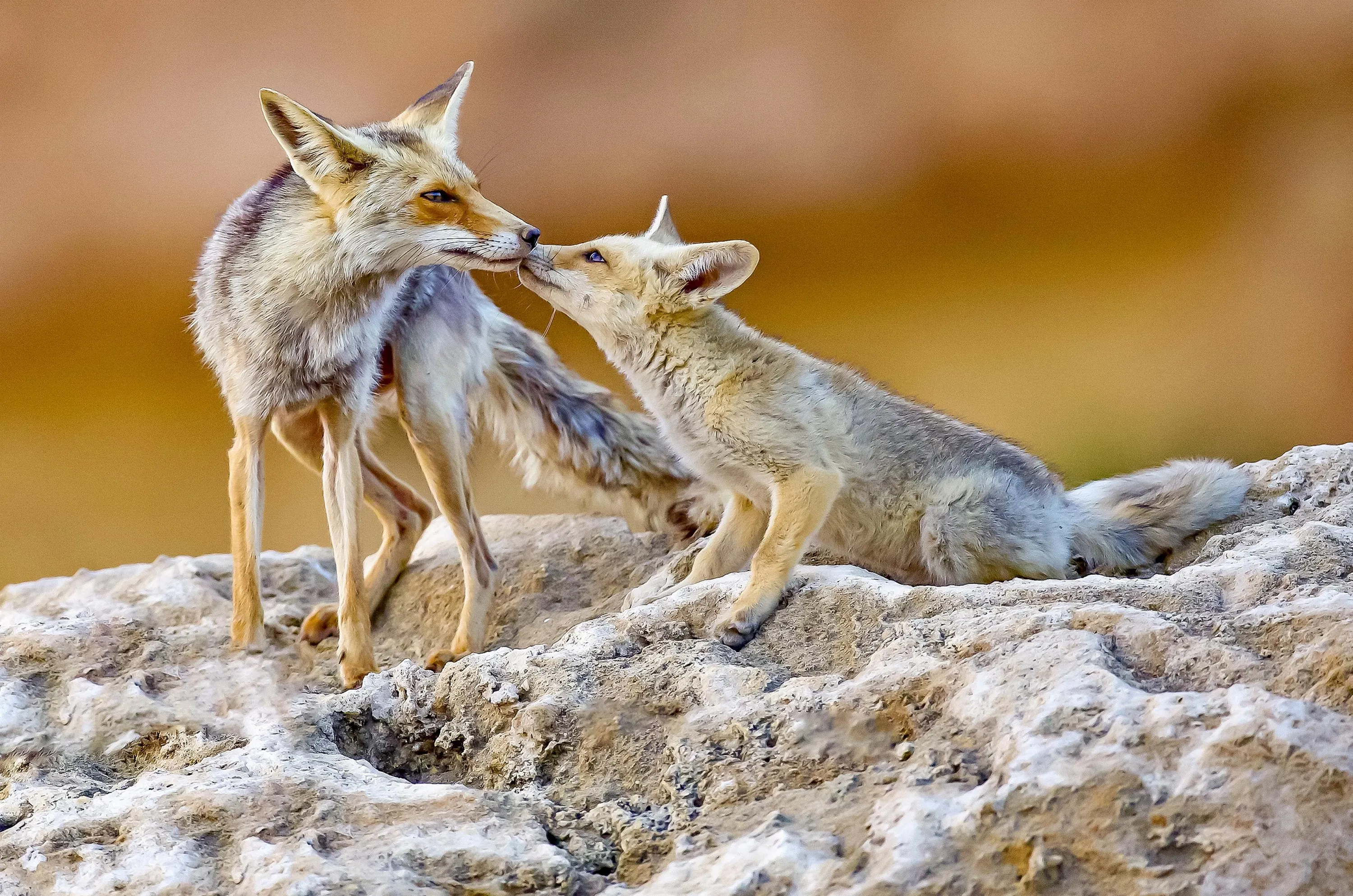 A pair of fox cubs, which are about six months old, play-fight on rocks at a quarry in the Negev region of southern Israel early September 2023. (Photo by David Manusevitch/Solent News)