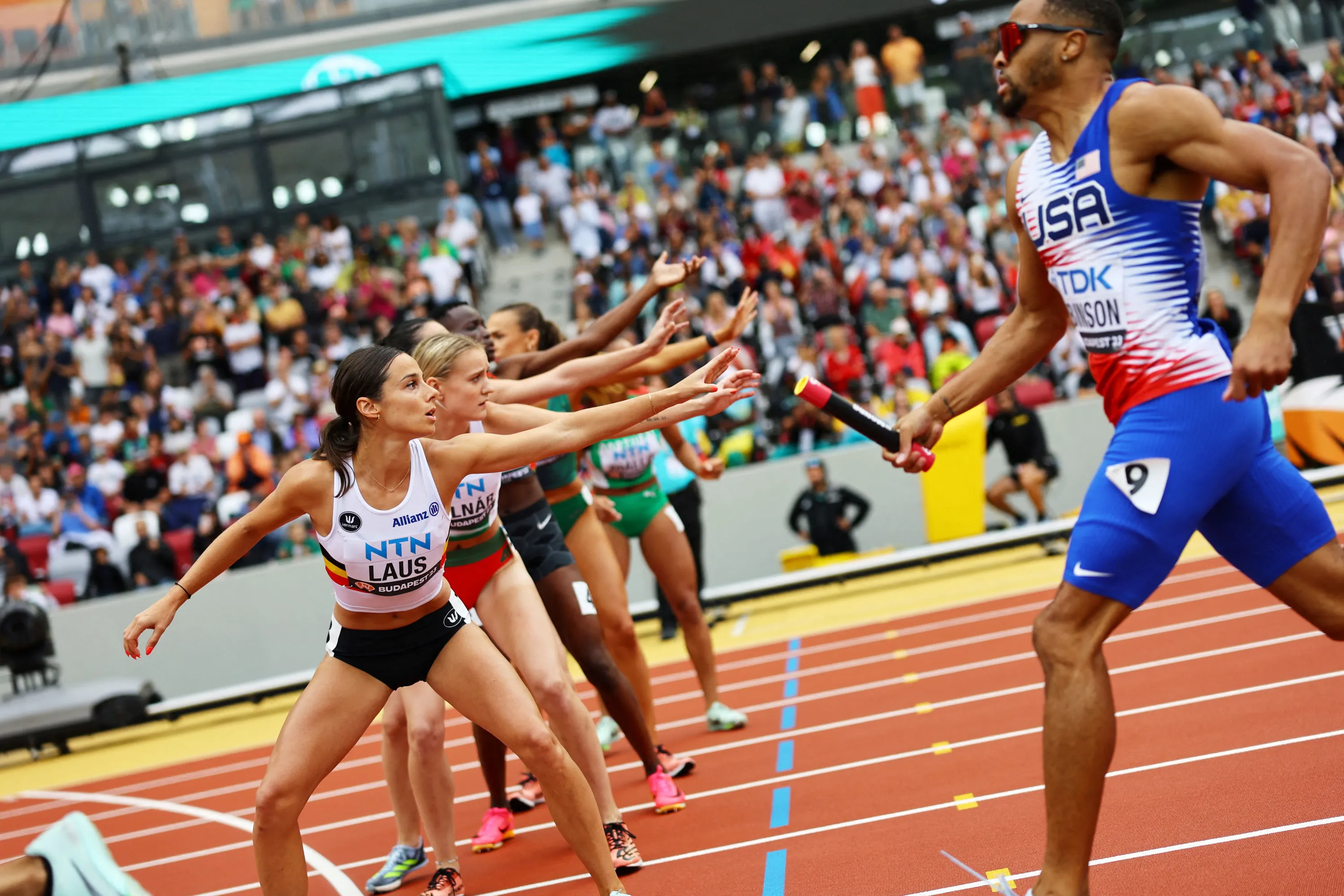 Racers wait for their batons during Heat 1 of the mixed 4x400m relay on August 19, 2023 in Budapest, Hungary. (Photo by Kai Pfaffenbach/Reuters)