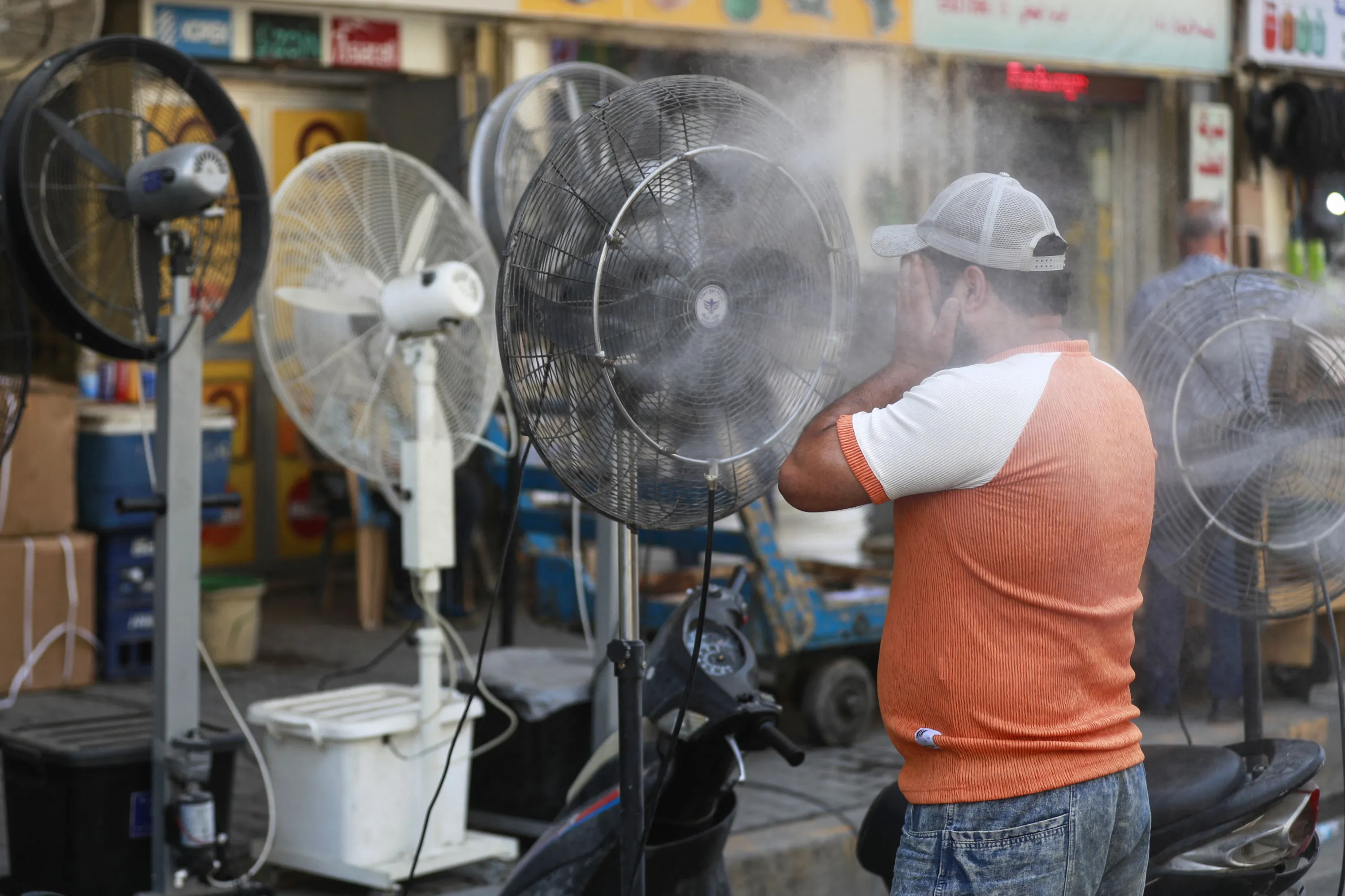 A man cools off with a mist dispenser set up on al-Jumhuriya street in central Baghdad amid soaring temperatures, on July 23, 2023. (Photo by Ahmad Al-Rubaye/AFP Photo)