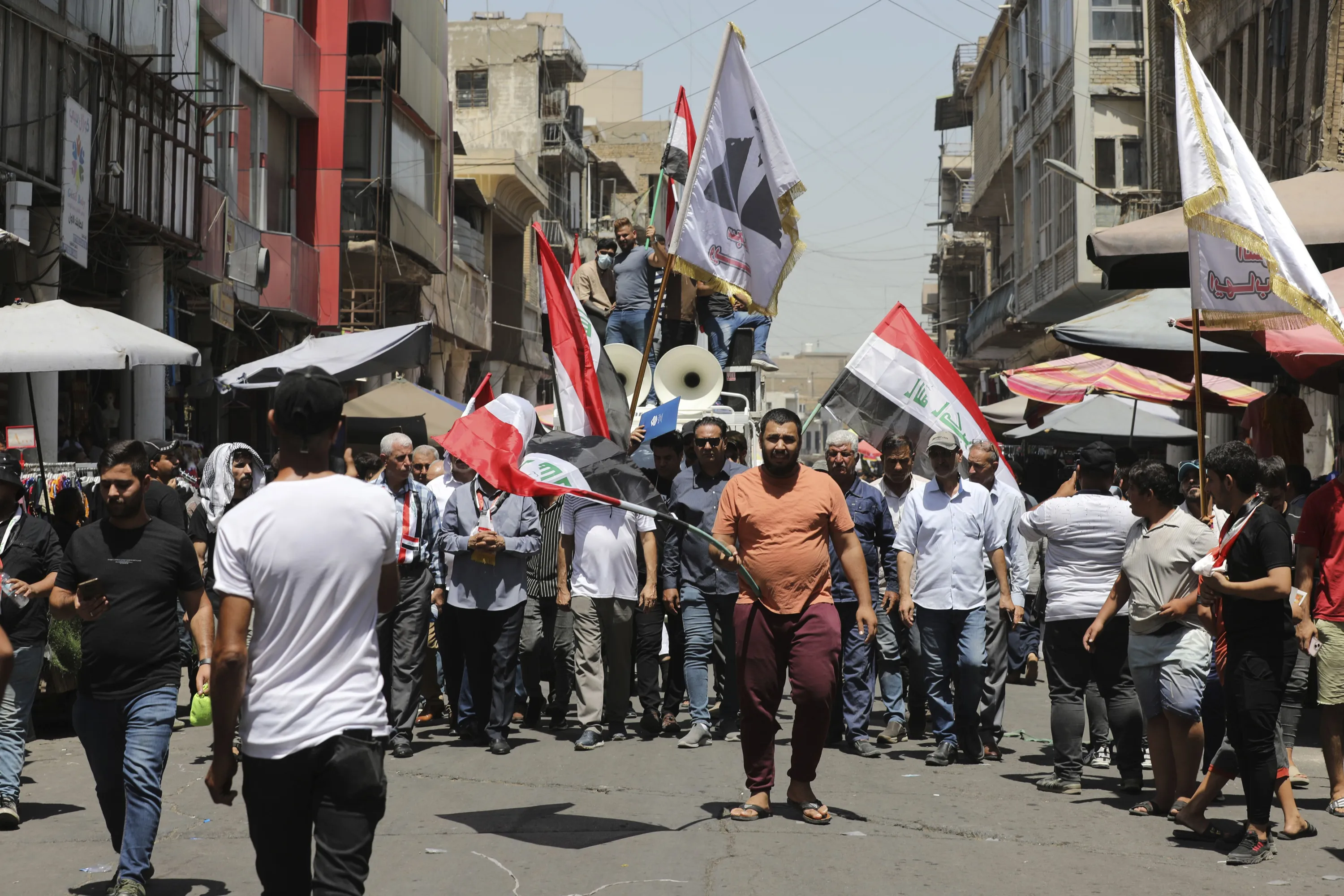 Demonstrators protest in front of the Iraqi central bank as currency plummets against the U.S. dollar, in Baghdad, Iraq, Wednesday, July. 26, 2023. Over the past two days, the market rate of the dollar jumped from 1,470 dinar per dollar to 1,570 dinar per dollar. (Photo by Hadi Mizban/AP Photo)
