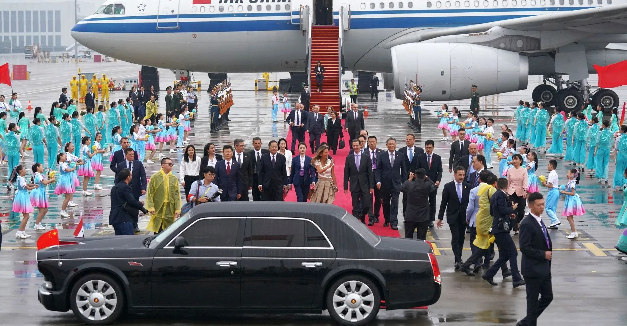 A handout picture released by the official Syrian Arab News Agency (SANA) shows Syria's President Bashar al-Assad (C-L) and First Lady Asma al-Assad (C-L) arriving at the airport in Beijing, on September 21, 2023. Assad on September 21 began his first official trip to China in almost two decades, with Beijing saying the visit will take ties to a “new level” as the Arab leader seeks financial support to help rebuild his devastated country. (Photo by SANA via Reuters)