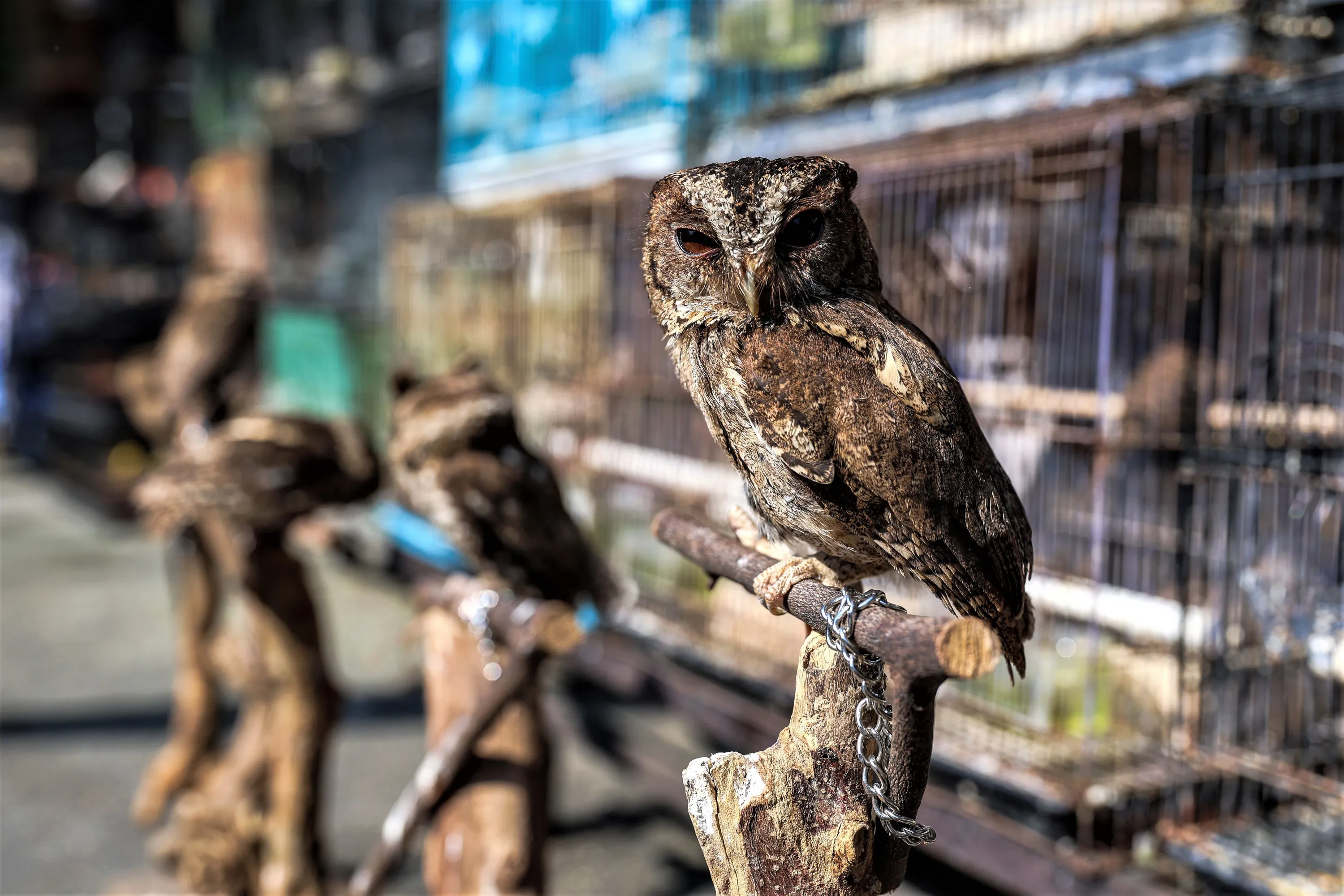 Owls for sale outside a cage at the bird market in Malang, East Java Province, Indonesia on August 14, 2023. Around 75 million birds are kept as pets in Java, threatening to wipe out some wild bird populations. Wild birds are smuggled illegally and traded on the black market to meet the demand for the pet trade, collectors, consumption, belief-based use, and even for bird fighting. Birds are one of the most traded groups with over 3,000 species, a third of all surviving species, reportedly affected by the trade. (Photo by Garry Andrew Lotulung/Anadolu Agency via Getty Images)