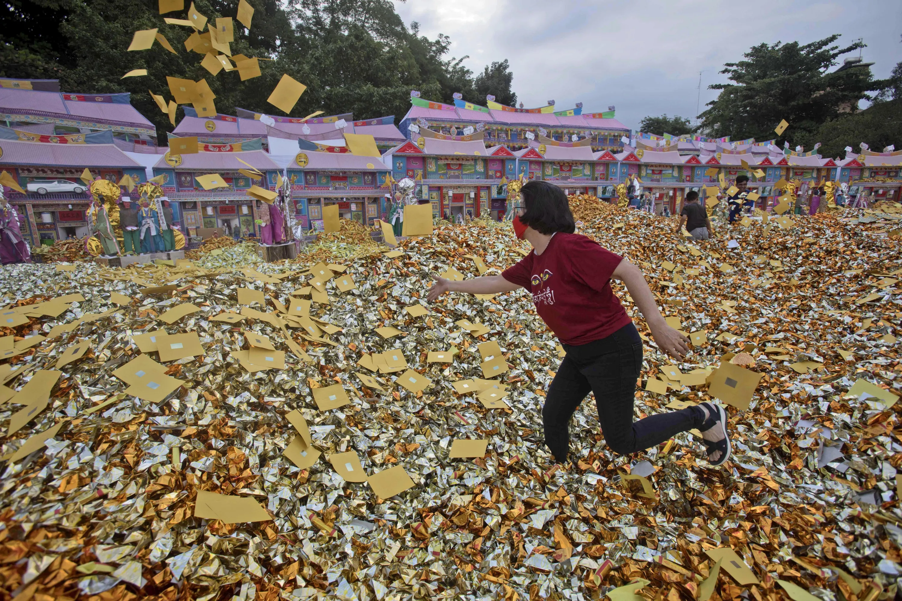 An ethnic Chinese woman throws imitation money known as “hell money” to be burned as offerings, during the Hungry Ghost Festival in Medan, North Sumatra, Indonesia, Wednesday, August 30, 2023. The festival is celebrated during the seventh month of the Chinese lunar calendar, when prayers are offered to the dead and offerings of food and paper-made models of items such as televisions and cars are burned to appease wandering spirits as it is believed that the gates of hell are opened during the month and the souls of dead ancestors return to visit their relatives. (Photo by Binsar Bakkara/AP Photo)