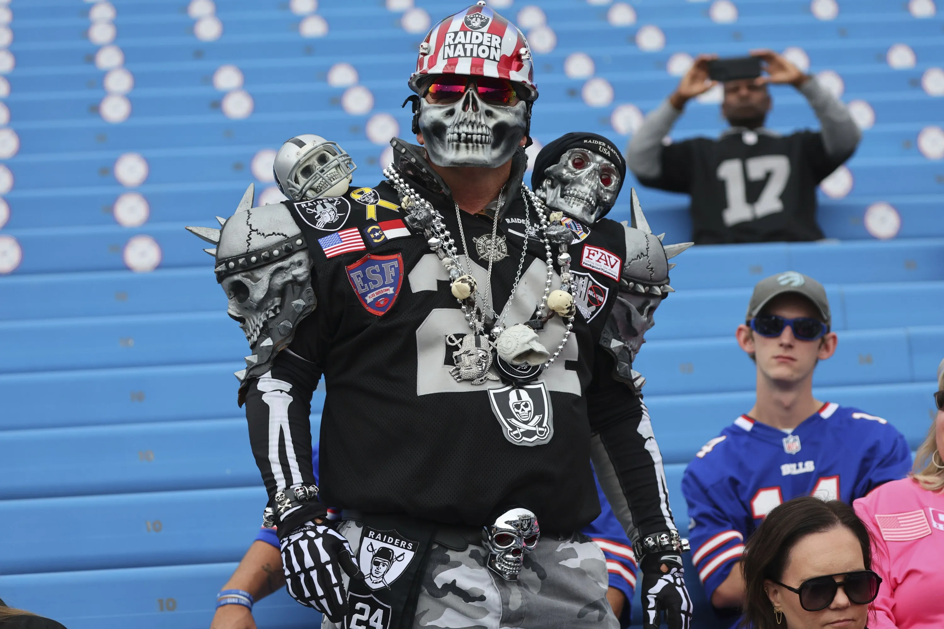 A Las Vegas Raiders fan watches teams warm up before an NFL football game between the Buffalo Bills and the Raiders, Sunday, September 17, 2023, in Orchard Park, N.Y. (Photo by Jeffrey T. Barnes/AP Photo)