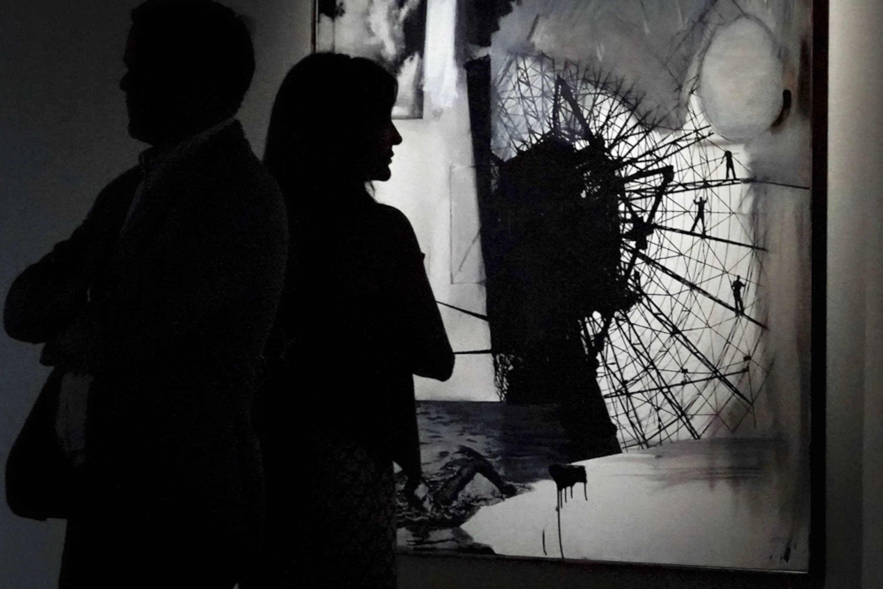 Visitors review Robert Rauschenberg's oil and silkscreen ink “Sundog”, from the collection of Emily Fisher Landau, a collector noted for her “vital role in shaping the unfolding story of 20th-century art”, on display at Sotheby's for auction, Thursday, September 14, 2023, in New York. (Photo by Bebeto Matthews/AP Photo)