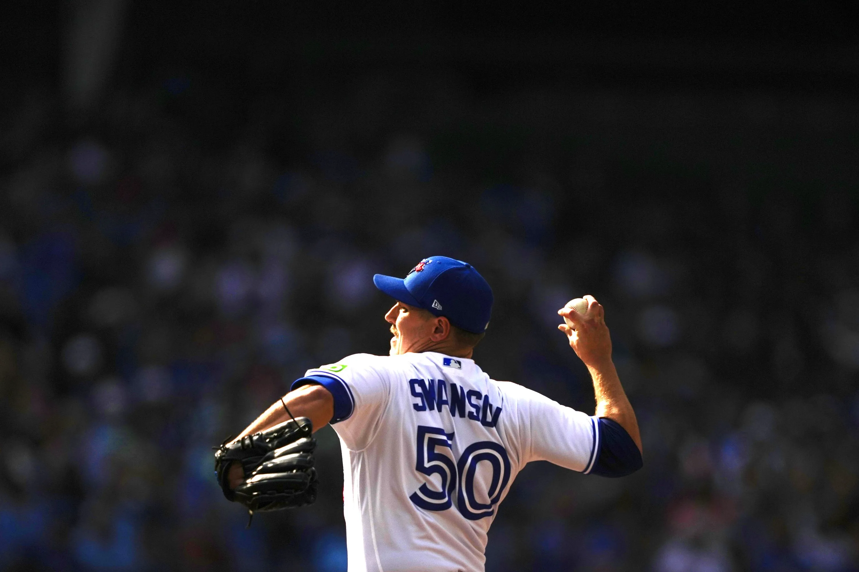 Toronto Blue Jays relief pitcher Erik Swanson (50) throws against the Boston Red Sox during the ninth inning of a baseball game in Toronto, Sunday, September 17, 2023. (Photo by Andrew Lahodynskyj/The Canadian Press via AP Photo)