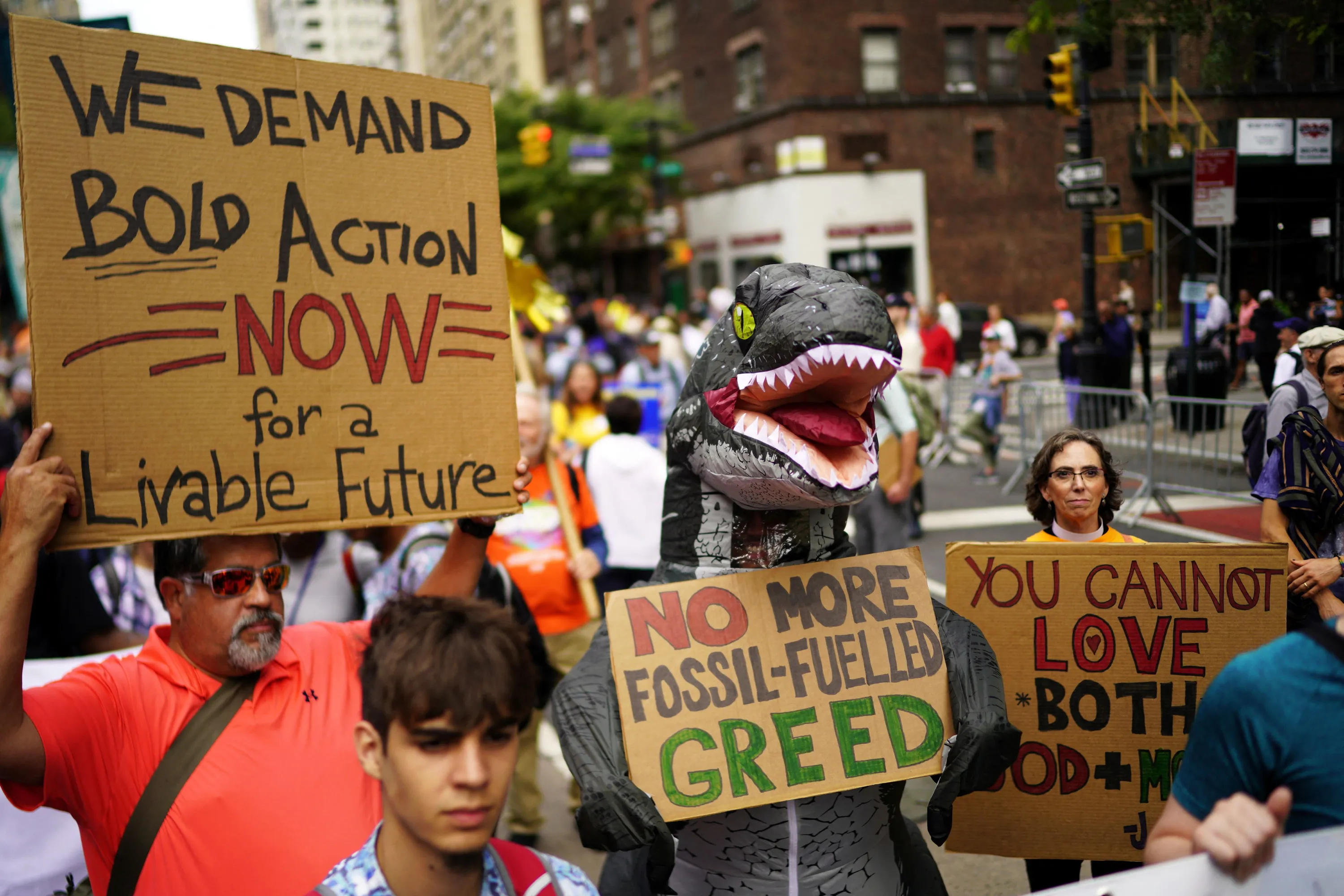 An activist wearing a dinosaur costume and other activists mark the start of Climate Week in New York during a demonstration calling for the U.S. government to take action on climate change and reject the use of fossil fuels in New York City, New York, U.S., September 17, 2023. (Photo by Eduardo Munoz/Reuters)