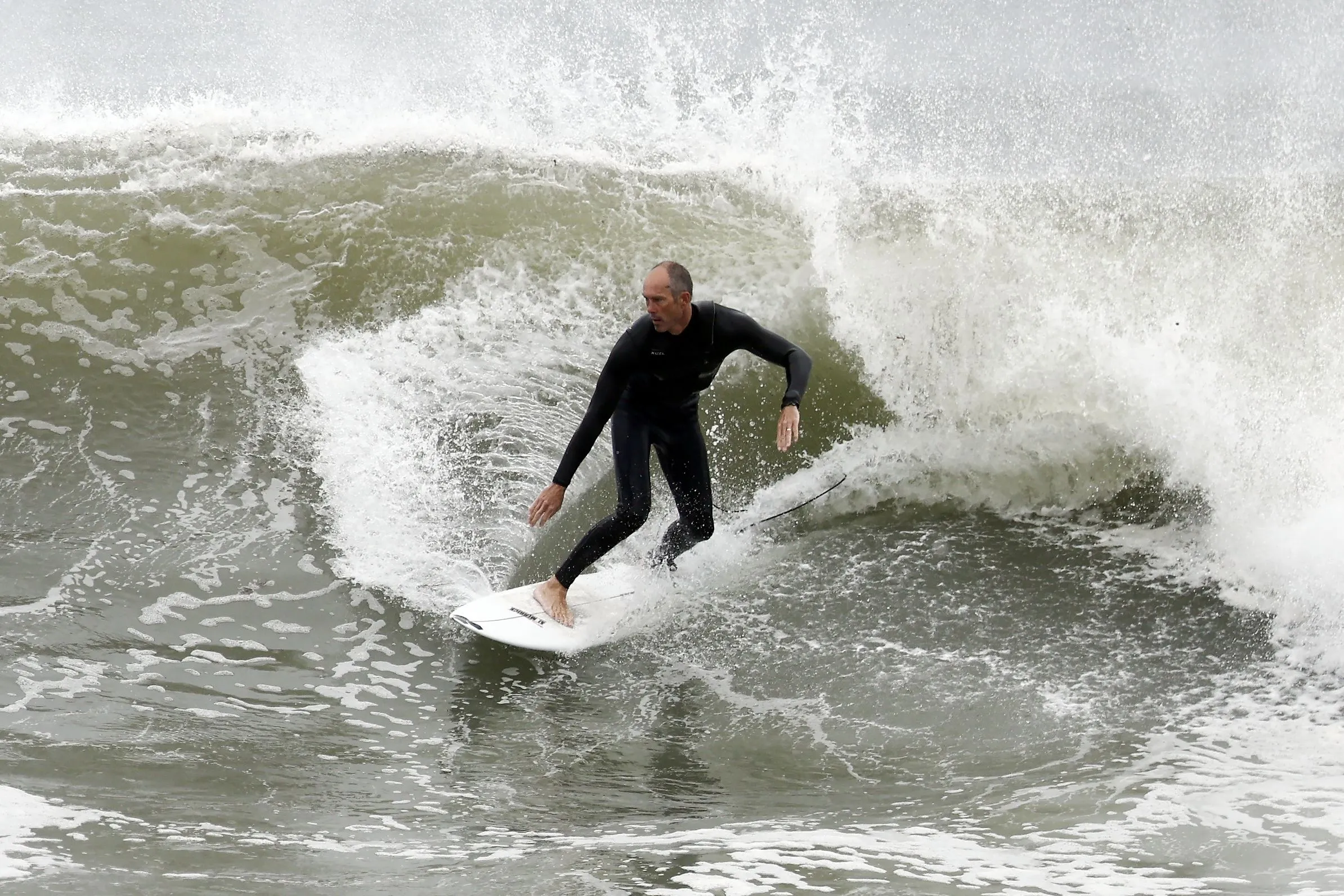 A surfer rides a wave, Saturday, September 15, 2023, in Hampton Beach, N.H. Severe conditions were predicted across parts of New England and hurricane conditions could hit the Canadian provinces of New Brunswick and Nova Scotia, where the storm, Lee, downgraded early Saturday from hurricane to post-tropical cyclone, was expected to make landfall later in the day. (Photo by Michael Dwyer/AP Photo)