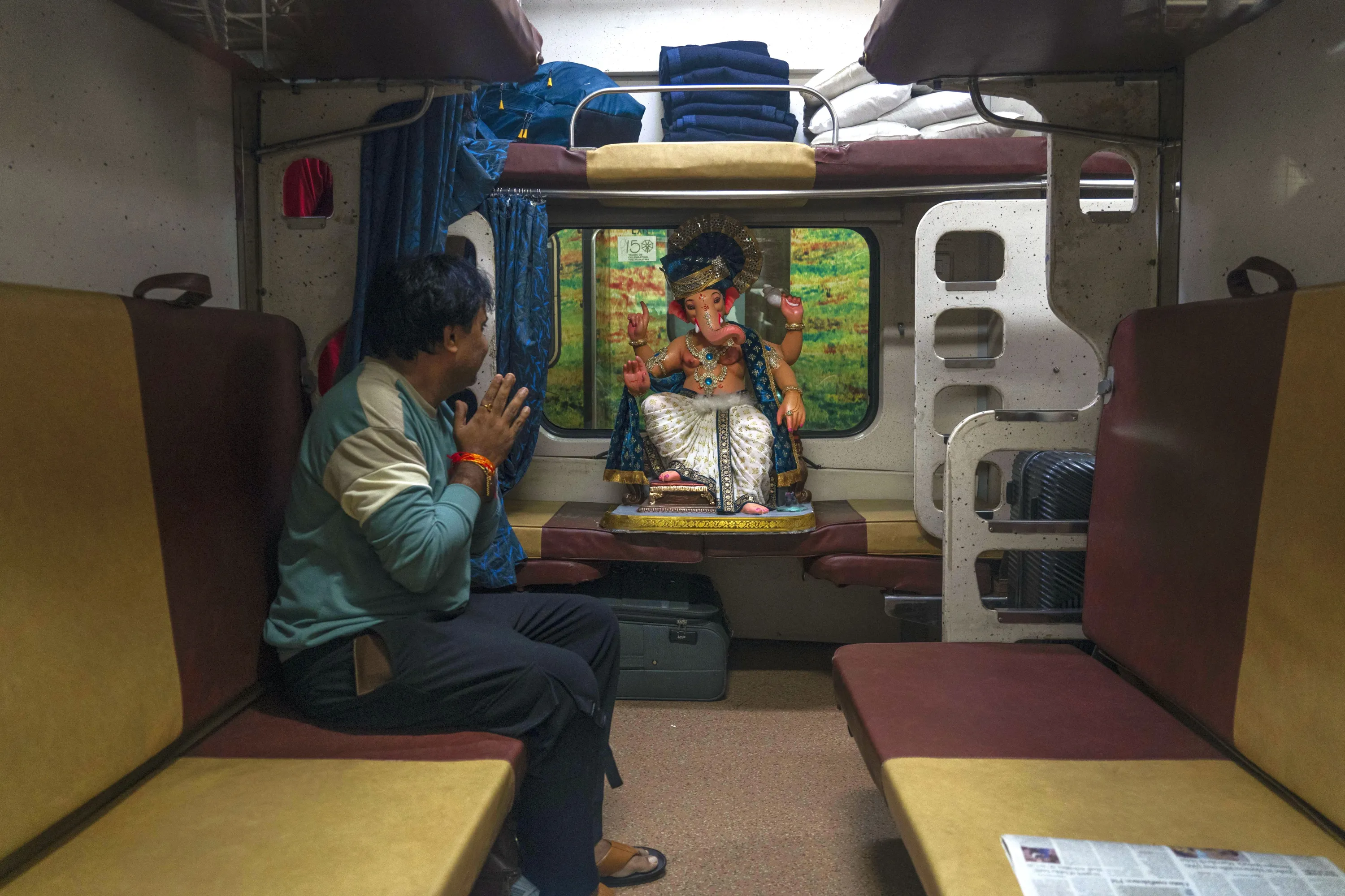 A Hindu devotee gestures respectfully towards a clay idol of elephant headed Hindu god Ganesh as he transports the same in a passenger train for worship in Mumbai, India, India, Sunday, September 10, 2023. Devotees will conduct prayers during the 10-day-long Ganesh Chaturti festival, which will end with the immersion of the idols in different water bodies. (Photo by Rafiq Maqbool/AP Photo)