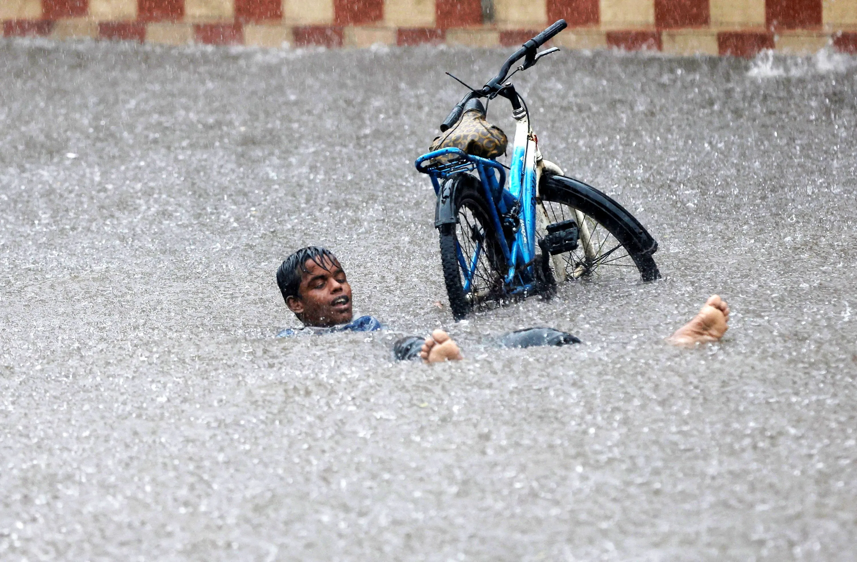 A boy plays on a flooded road amid heavy rainfall in Ahmedabad, India on September 17, 2023. (Photo by Amit Dave/Reuters)