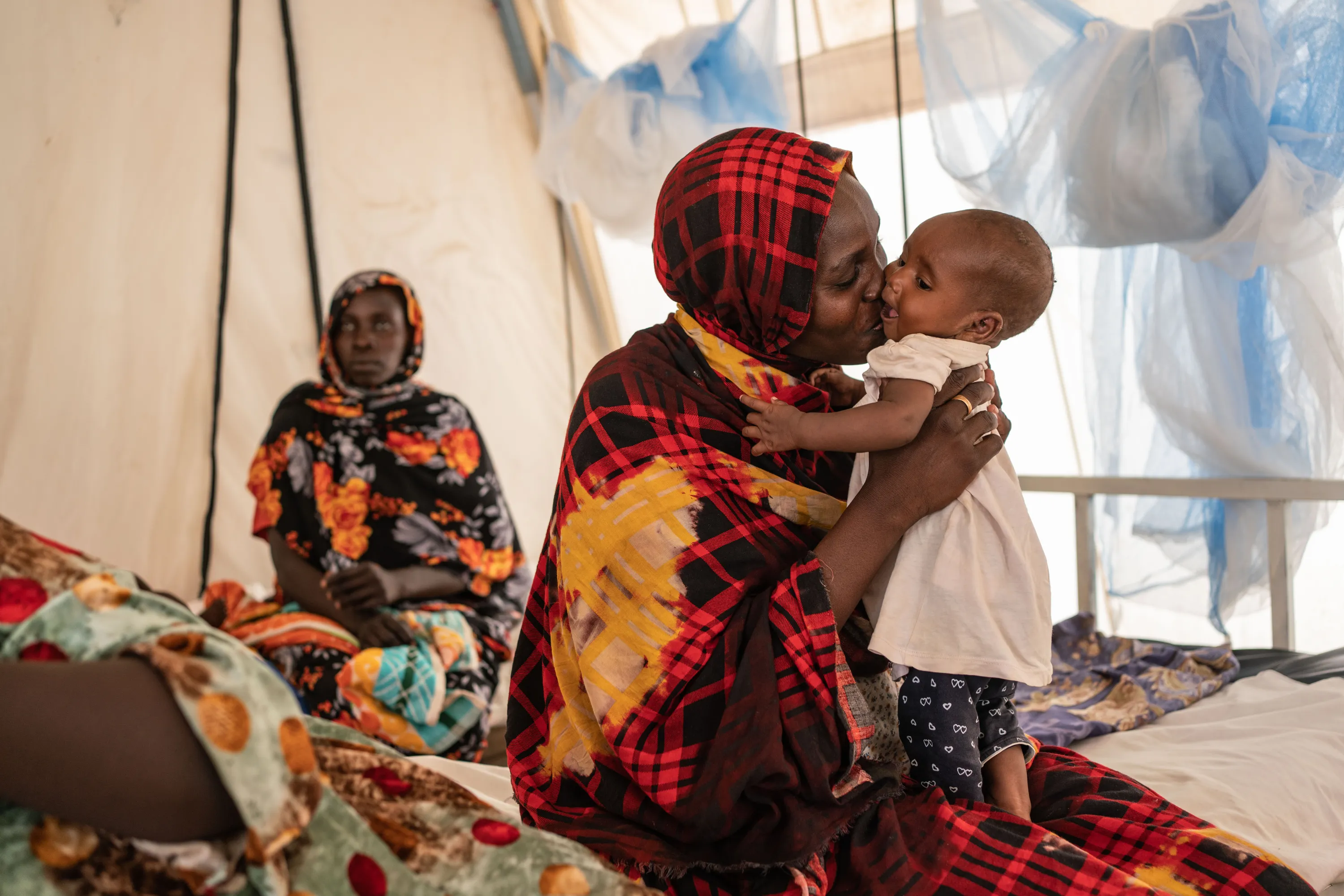 Jamia Ishak Osman, 35, kisses her child who is suffering from malaria at the malaria department tent in the Doctors Without Borders clinic inside the Adre camp, where around 200,000 people are currently taking refuge on September 19, 2023 in Adre, Chad. The conflict in Sudan, entering its sixth month, has left thousands of civilians dead and displaced more than five million people. More than 420,000 people have already found refuge in neighbouring Chad as hundreds continue to arrive daily. (Photo by Abdulmonam Eassa/Getty Images)