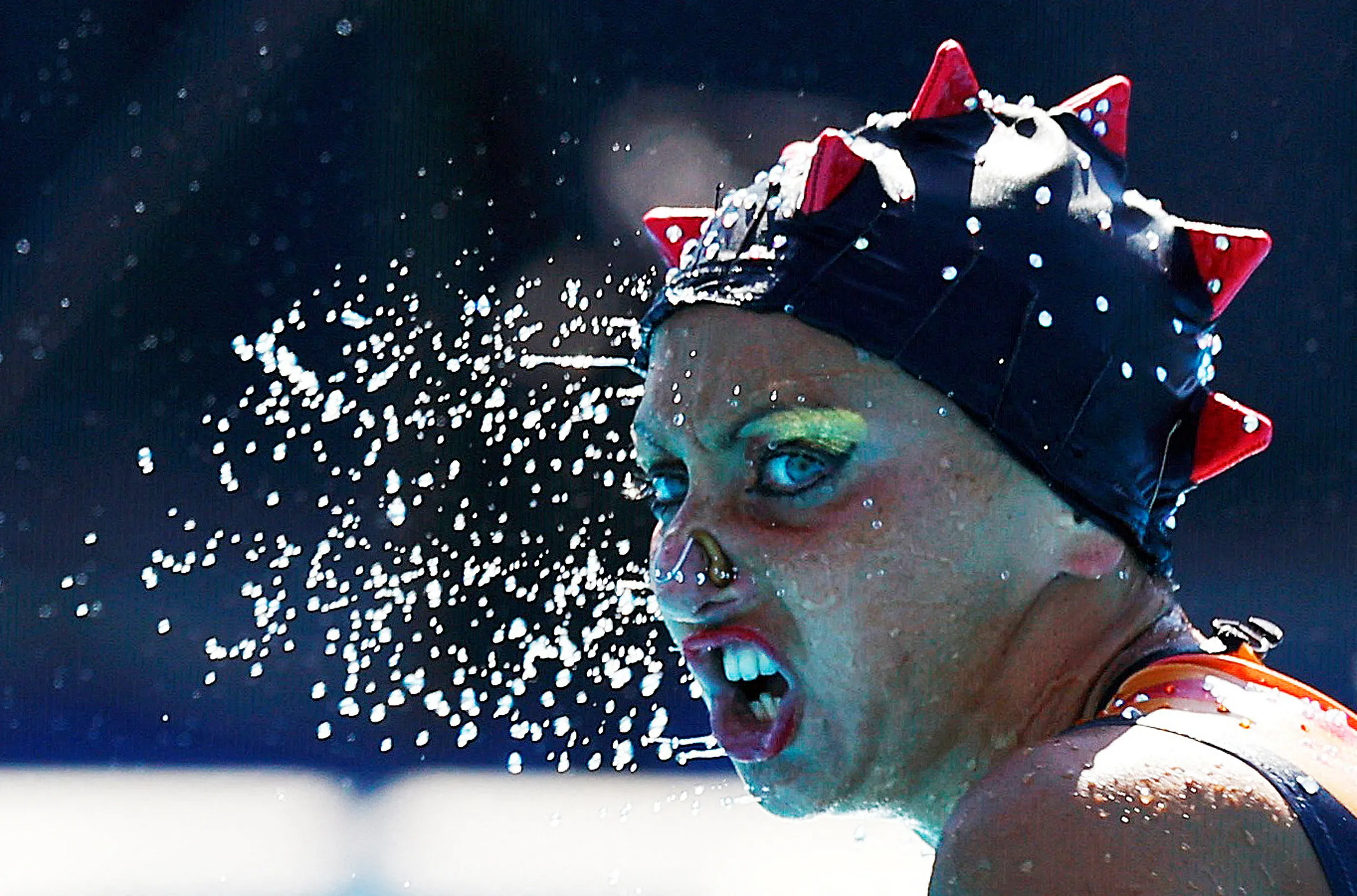 A member of the Italian team performs during the women's-team artistic-swimming highlight final during the FINA World Championships at Alfréd Hajós swimming complex in Budapest, Hungary, on June 25, 2022. (Photo by Lisa Leutner/Reuters)