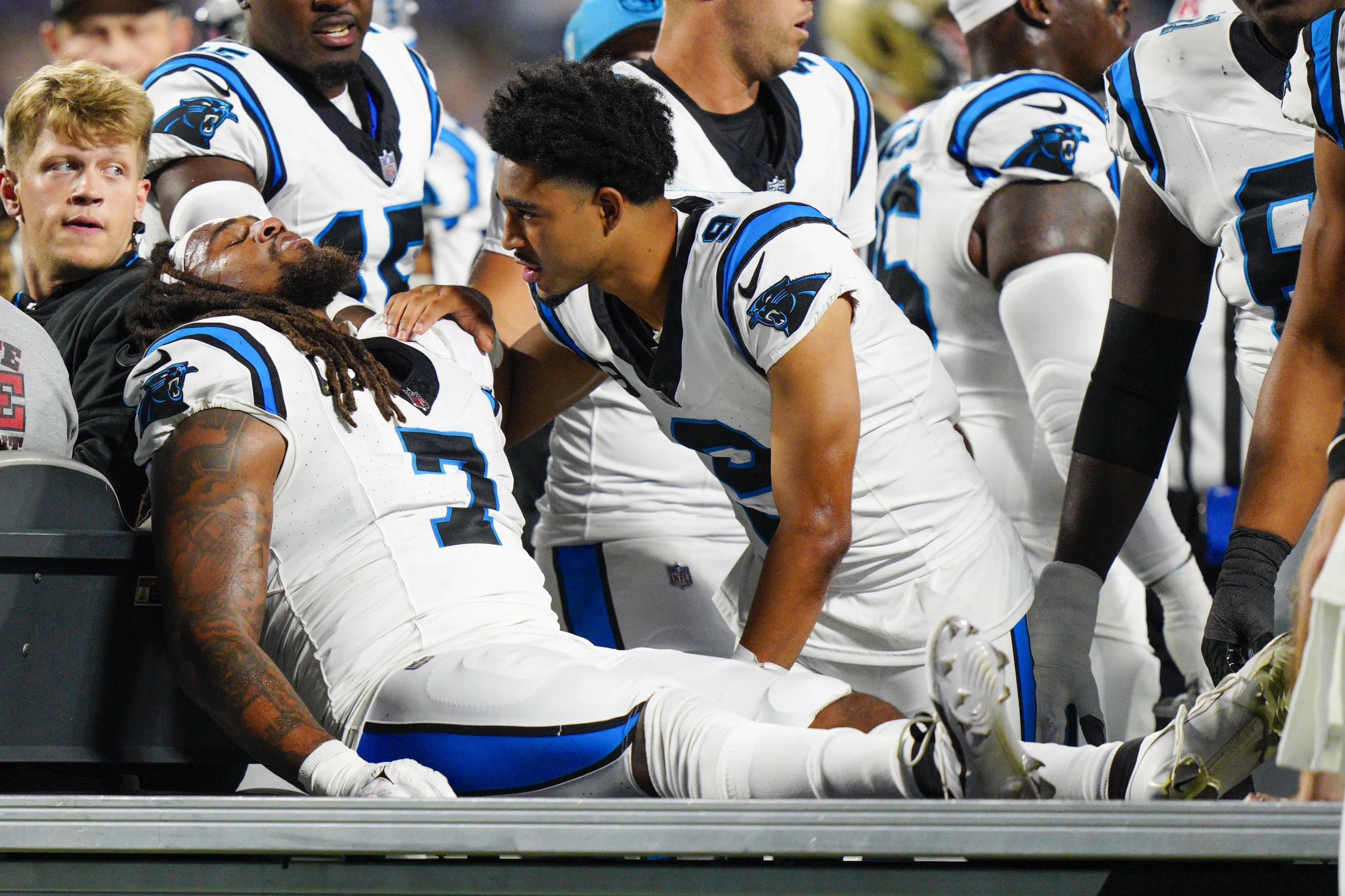 Carolina Panthers quarterback Bryce Young talks to linebacker Shaq Thompson as he leaves the field after being hurt during the first half of an NFL football game against the New Orleans Saints Monday, September 18, 2023, in Charlotte, N.C. (Photo by Jacob Kupferman/AP Photo)