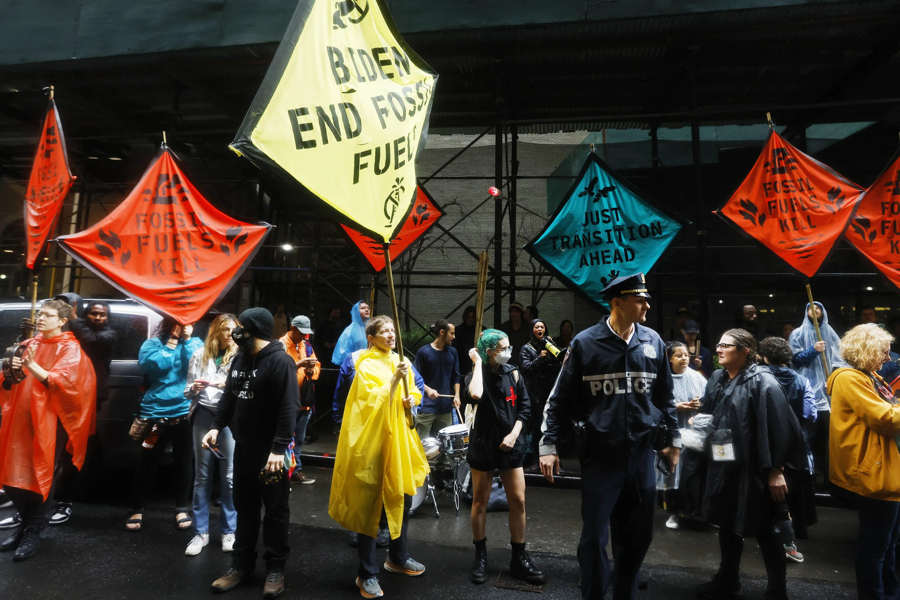 Climate activists protest outside the Federal Reserve Bank of New York to call for an end to the use of fossil fuels, Monday, September 18, 2023, in New York. (Photo by Jason DeCrow/AP Photo)