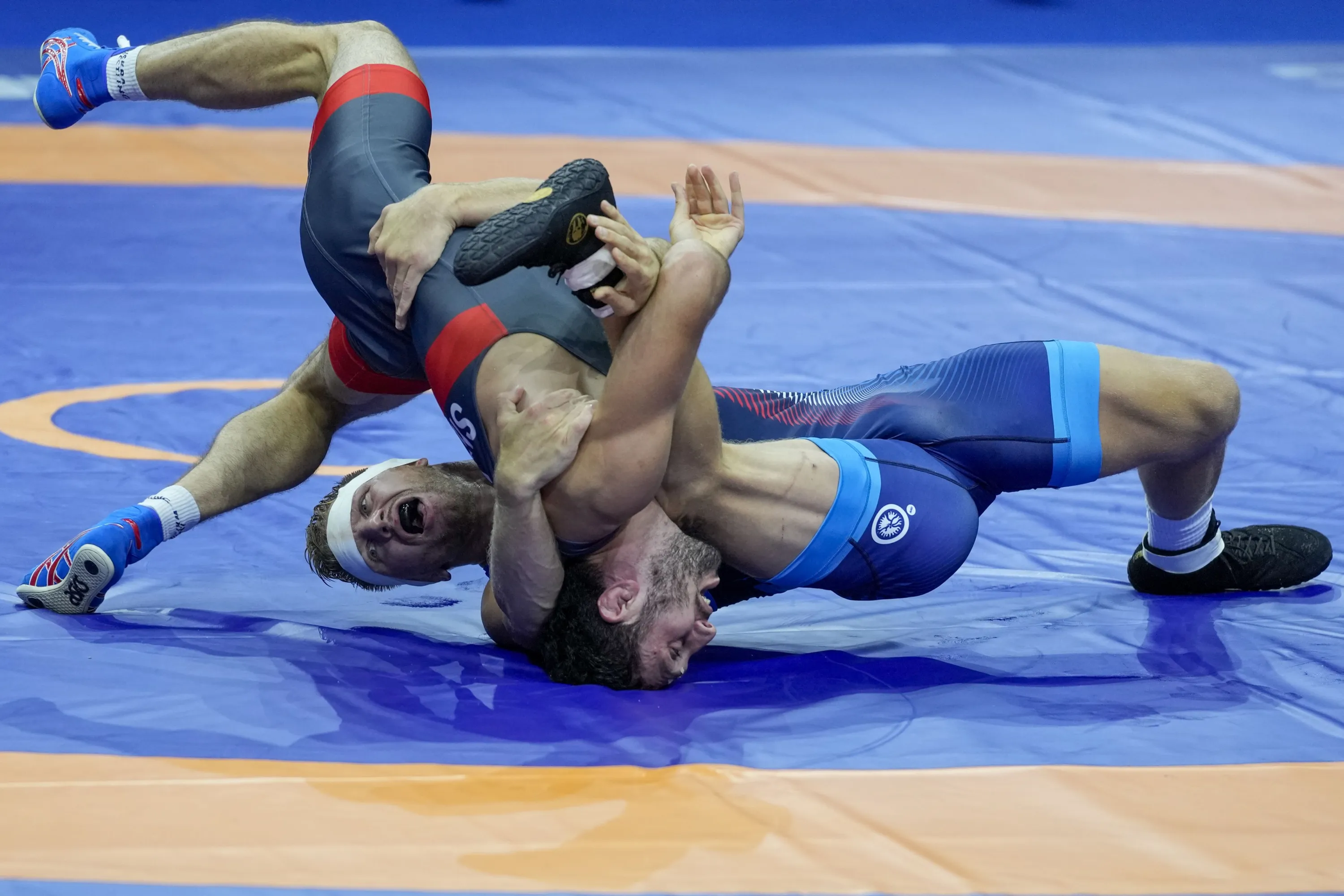 Zaurbek Sidakov of Russia, left, and Kyle Douglas Dake of the US compete in their men's freestyle 74 kg wrestling final match during the Wrestling World Championships in Belgrade, Serbia, Monday, September 18, 2023. (Photo by Darko Vojinovic/AP Photo)