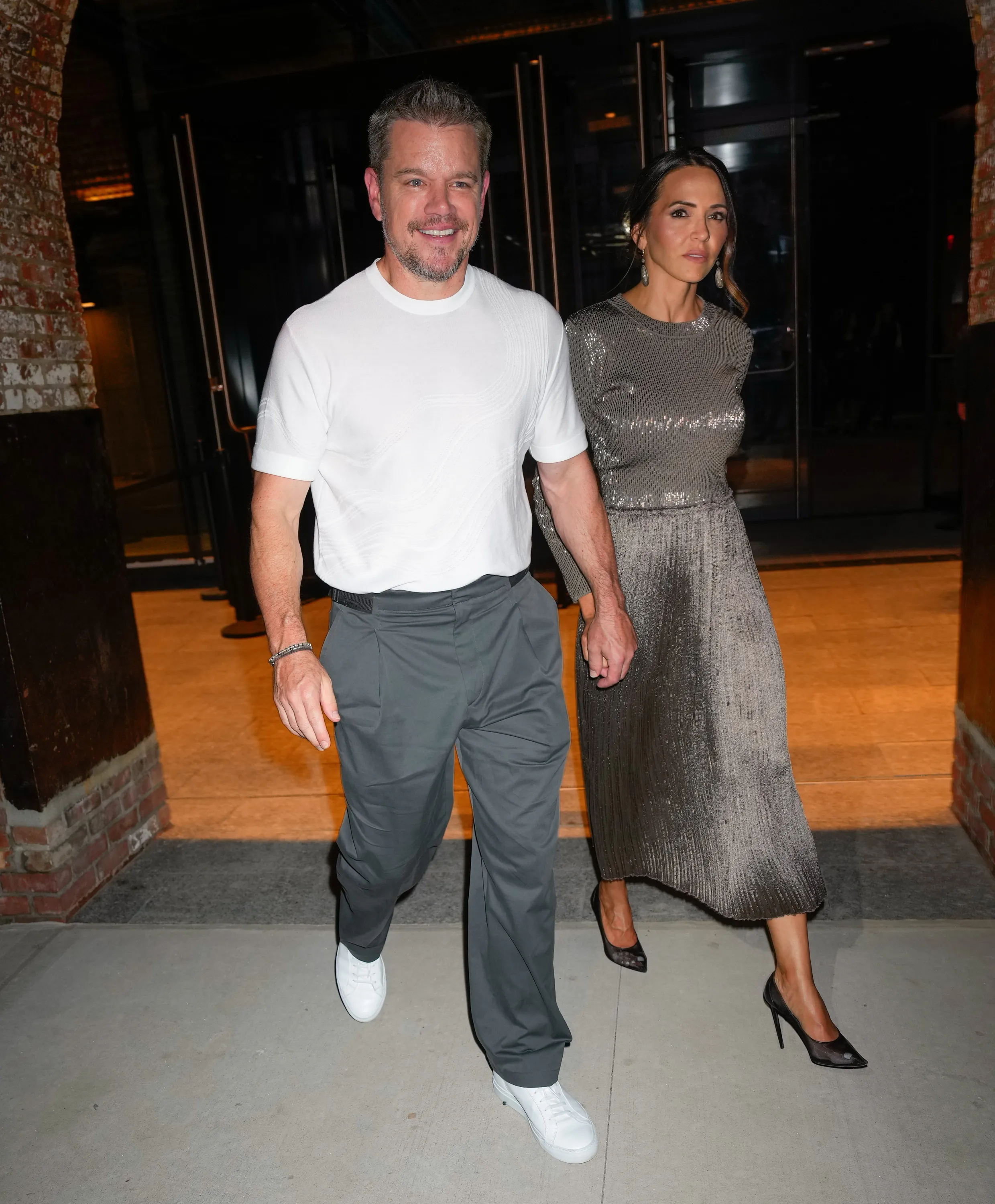 American actor Matt Damon and his wife Luciana Barroso are seen coming out of the Hermes Fashion show on September 14, 2023 in New York City. (Photo by Gotham/GC Images)