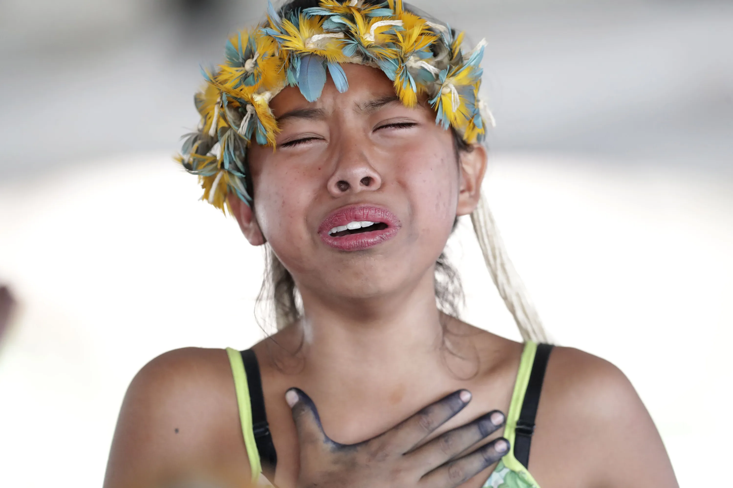 An Indigenous woman cries tears of happiness after learning that the Supreme Court ruled to enshrine Indigenous land rights, in Brasilia, Brazil, Thursday, September 21, 2023. Six of the 11 Supreme Court justices voted against establishing a cut-off date after which Indigenous peoples could not claim new territory. (Photo by Gustavo Moreno/AP Photo)