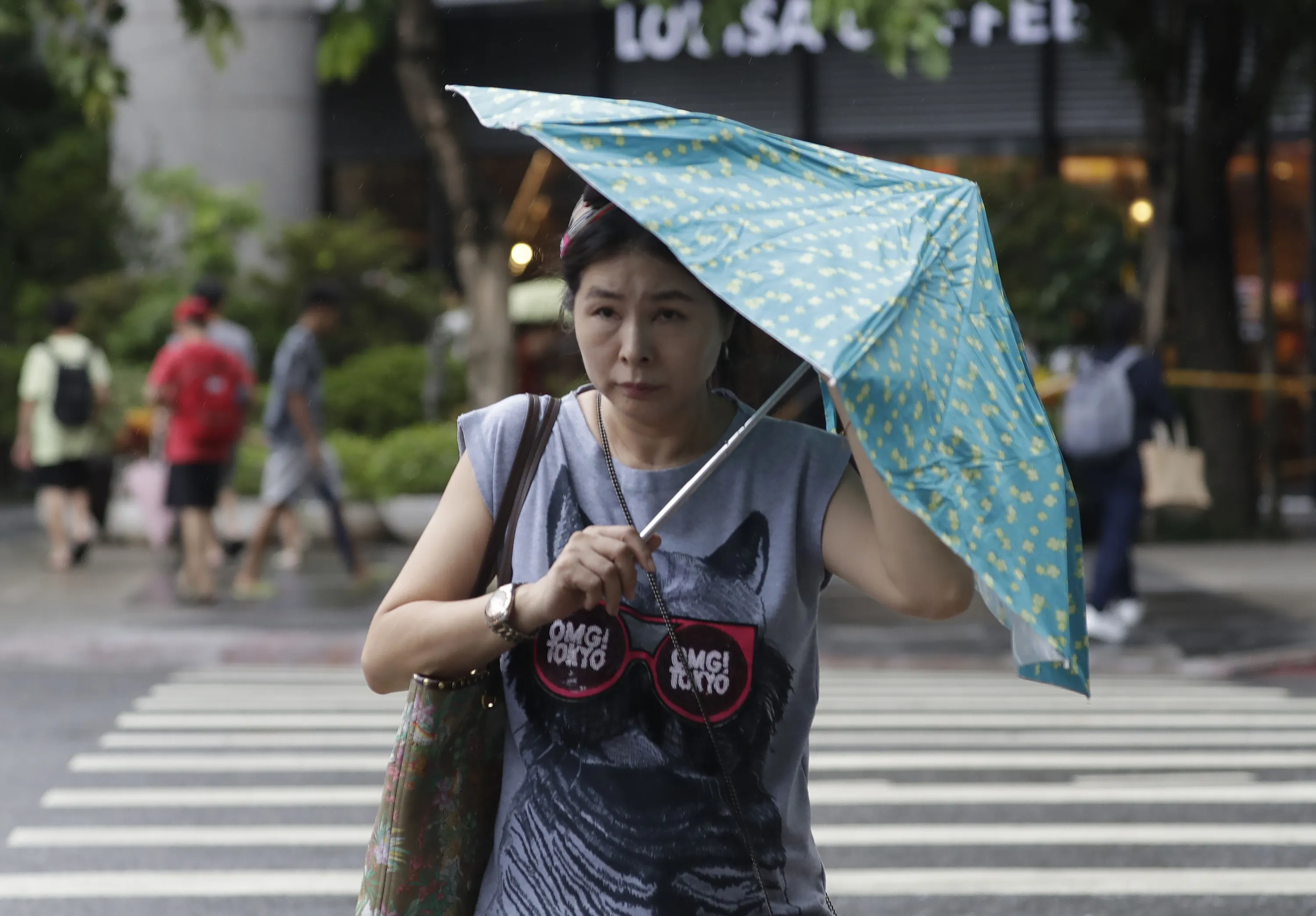 A woman struggles with her umbrella against gusts of wind generated by Typhoon Haikui in Taipei, Taiwan, Sunday, September 3, 2023. (Photo by Chiang Ying-ying/AP Photo)