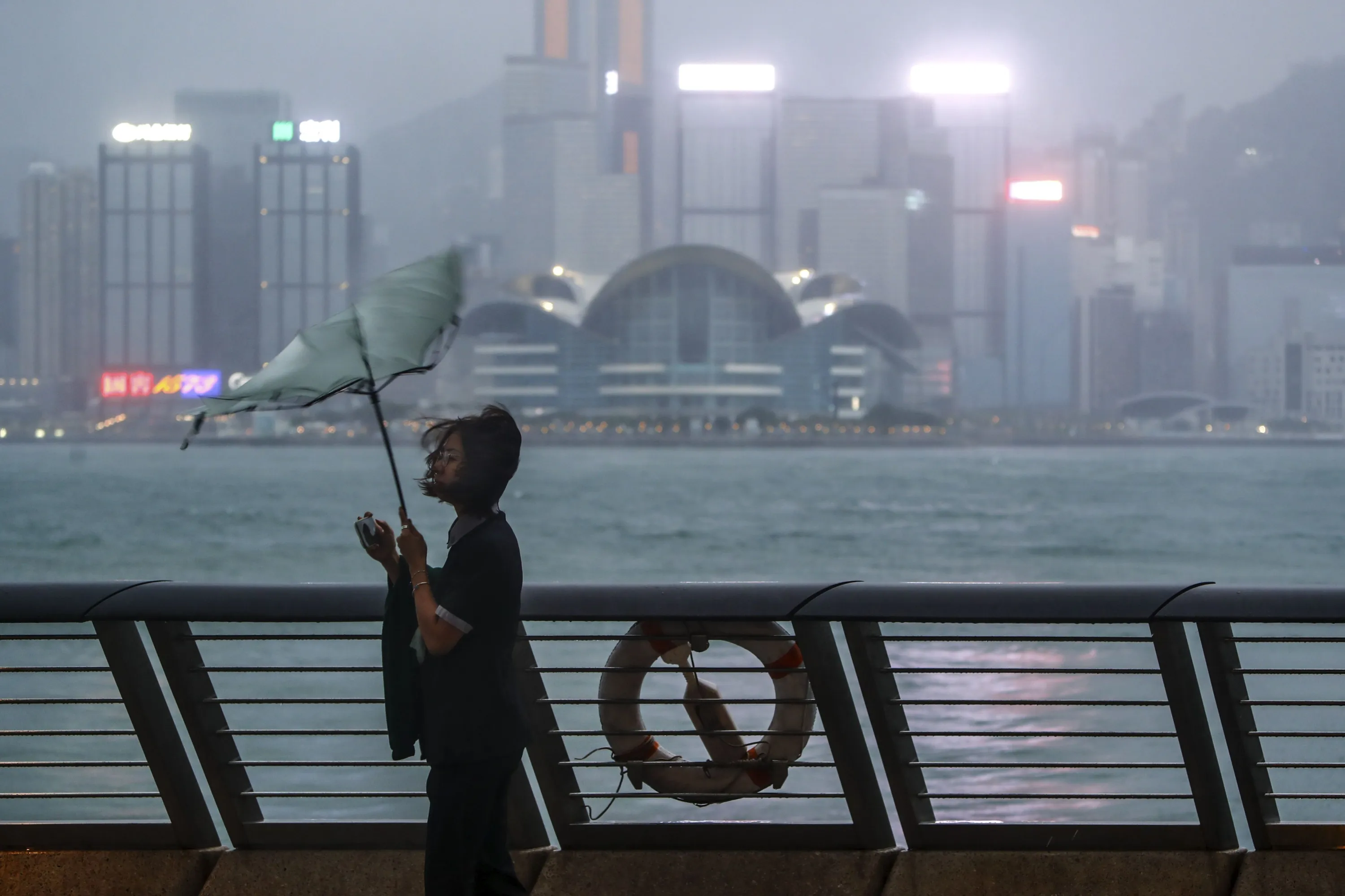 A woman's umbrella is blown at the seaside as typhoon Saola strikes the city with strong winds and rain, in Hong Kong, Friday, September 1, 2023. Most of Hong Kong and other parts of southern China ground to a near standstill Friday with classes and flights canceled as powerful Typhoon Saola approached. (Phoot by Daniel Ceng/AP Photo)