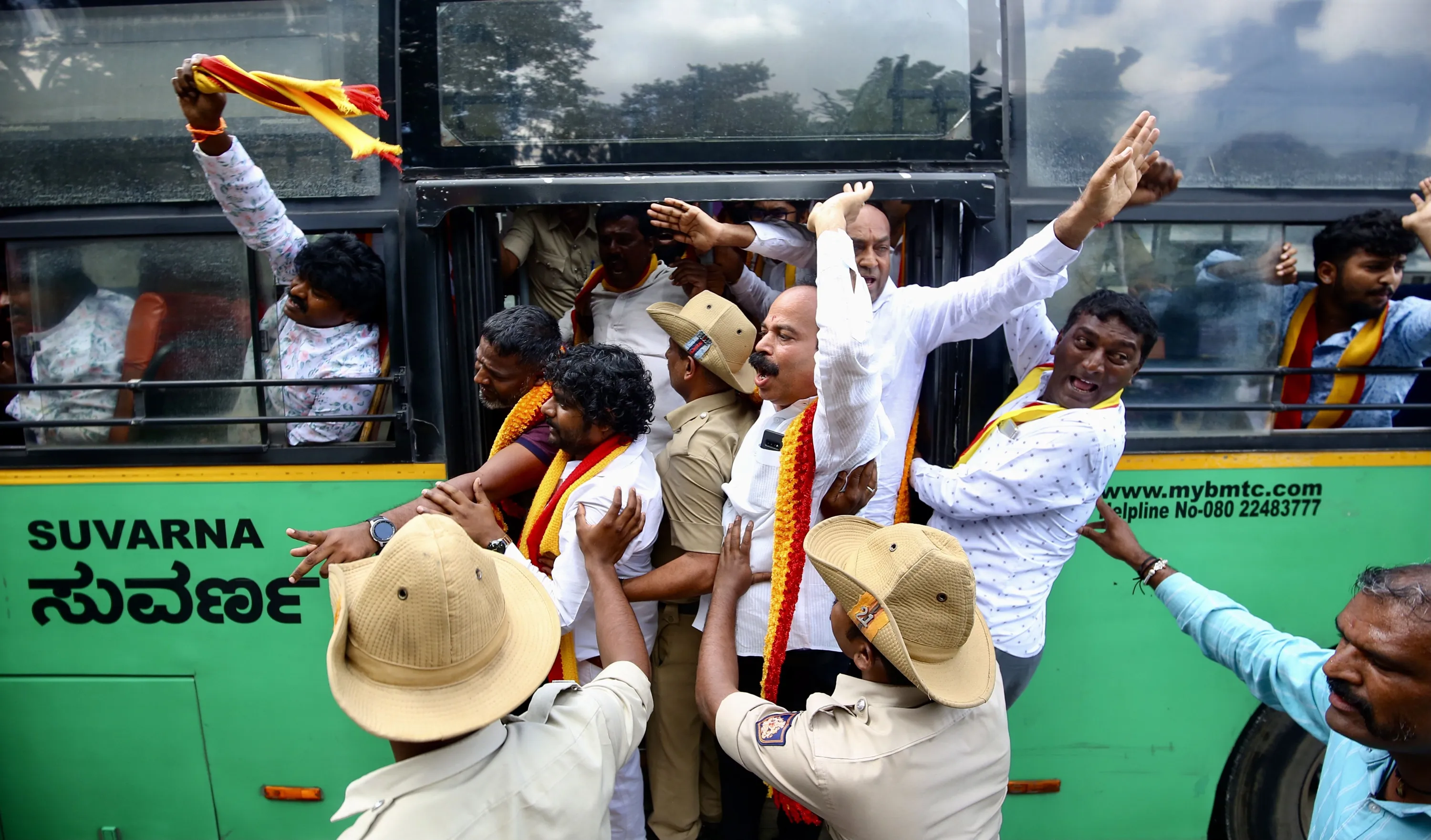 Indian police force pro-Kannada activists into a bus during a protest against the Supreme Court's order on the Cauvery river water dispute and Tamil Nadu chief minister in Bangalore, India, 26 September 2023. Hundreds of farmers and pro-Kannada activists staged a protest calling for a “Bangalore Bandh” and Section 144 implemented across the city, following the Indian Supreme Court's order and the Cauvery Water Management Authority (CWMA) order directed Karnataka to continue releasing 5,000 cusecs of water to Tamil Nadu for another 15 days. (Photo by Jagadeesh N.V./EPA)