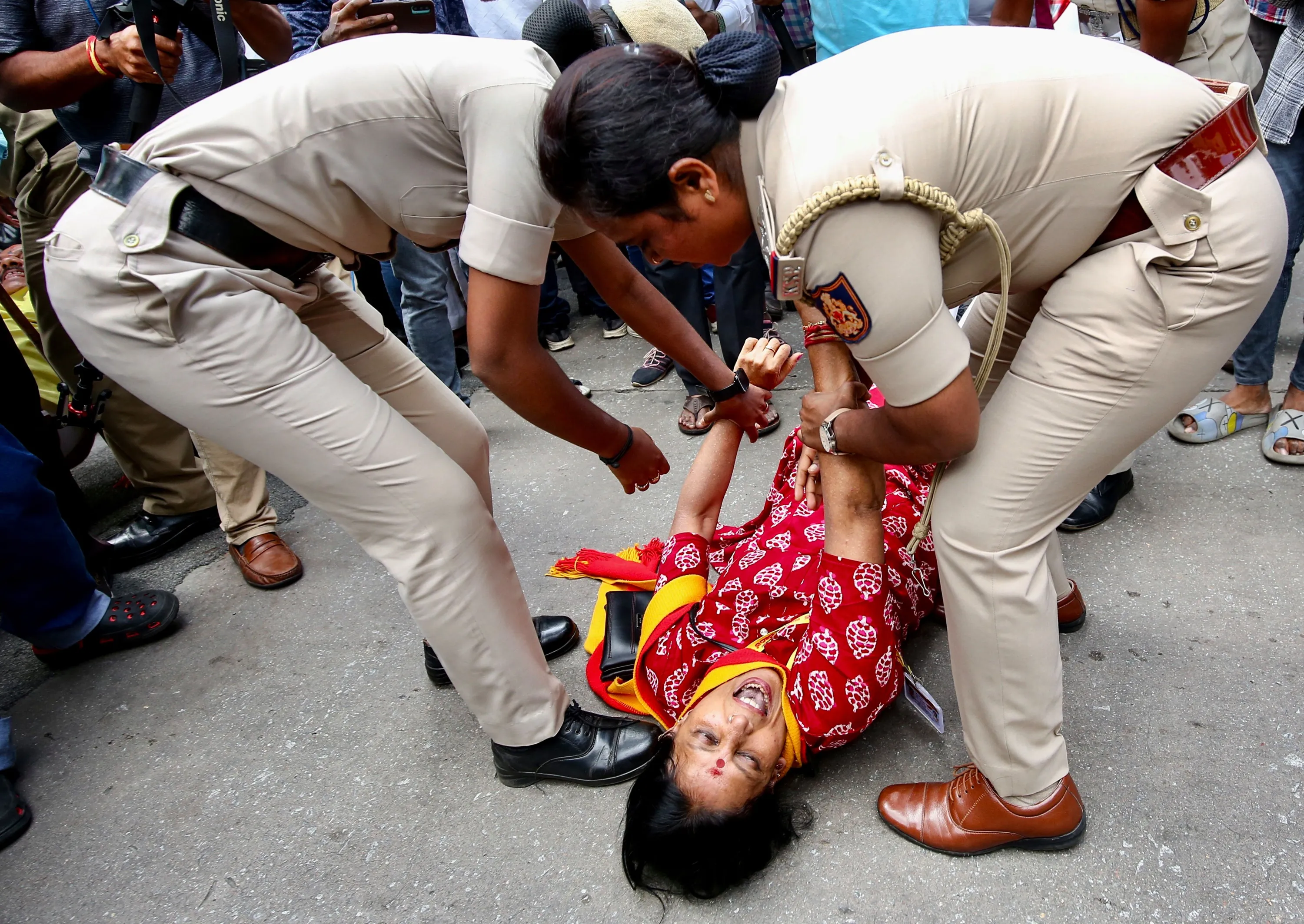 Indian police detain a woman during a protest by pro-Kannada activists against the Supreme Court's order on the Cauvery river water dispute and Tamil Nadu chief minister in Bangalore, India, 26 September 2023. Hundreds of farmers and pro-Kannada activists staged a protest calling for a “Bangalore Bandh” and Section 144 implemented across the city, following the Indian Supreme Court's order and the Cauvery Water Management Authority (CWMA) order directed Karnataka to continue releasing 5,000 cusecs of water to Tamil Nadu for another 15 days. (Photo by Jagadeesh N.V./EPA/EFE)